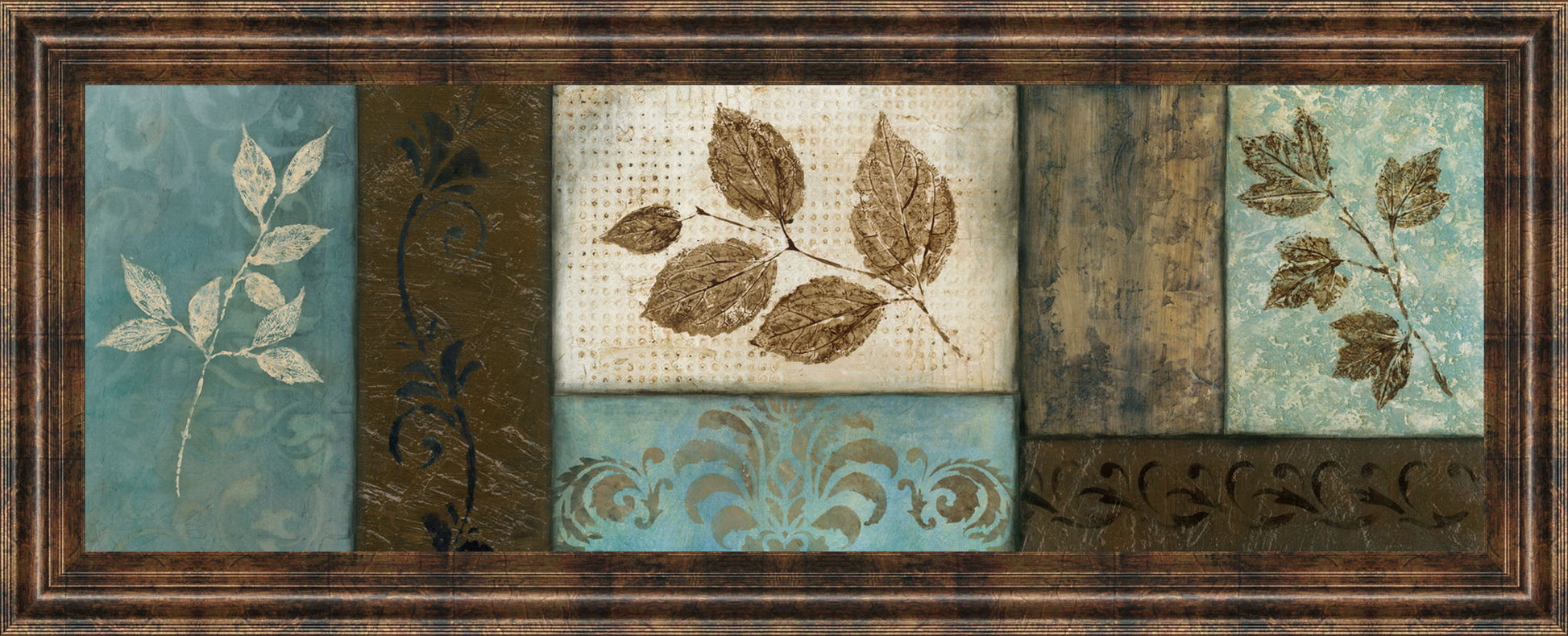 Step into a tranquil world with this captivating piece that blends delicate botanical motifs with a soothing palette of soft blues, earthy browns, and creamy beiges. The artwork's textured layers and subtle leaf patterns create a serene ambiance, perfect for bringing nature's quiet elegance into your living room or office. Framed in a rich dark chocolate finish with premium real glass, this piece offers a refined touch of sophistication while protecting the art beneath. Its horizontal orientation and transitional style make it a versatile addition that harmonizes effortlessly with various decor themes, inviting calm and timeless beauty into your space.