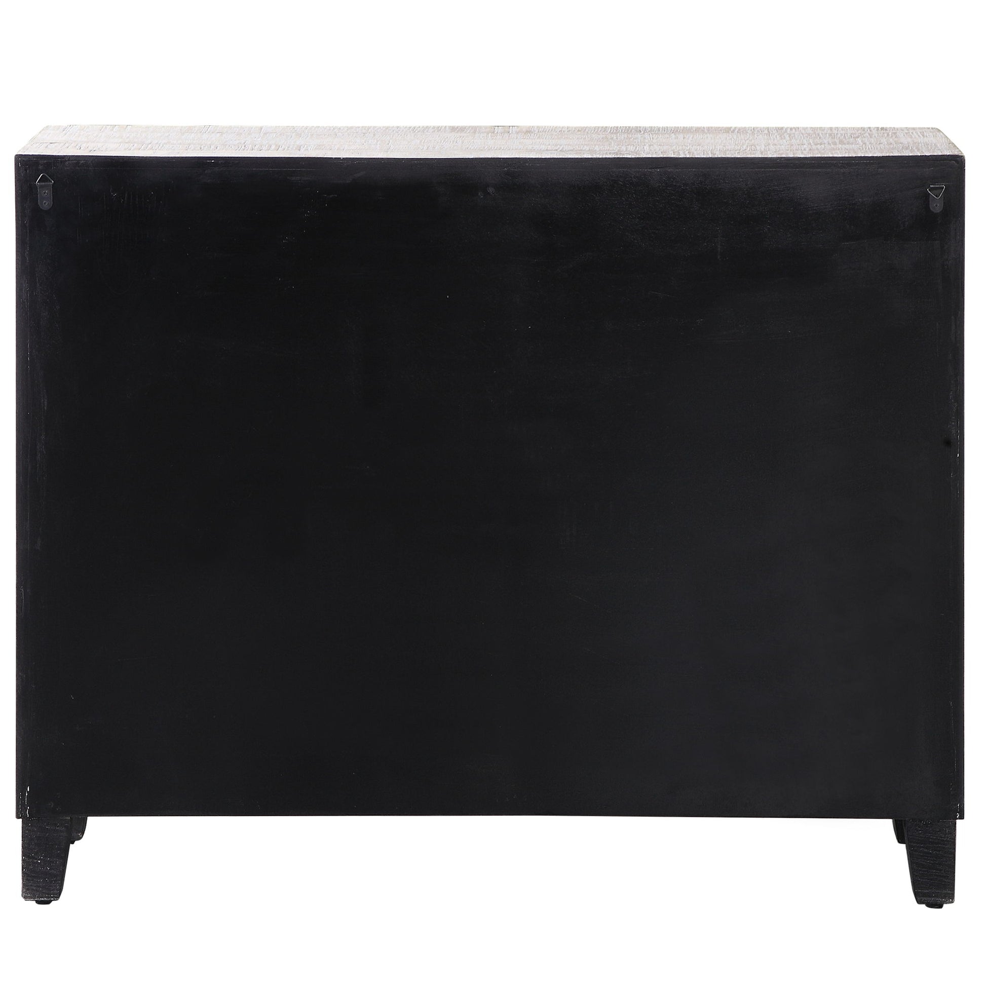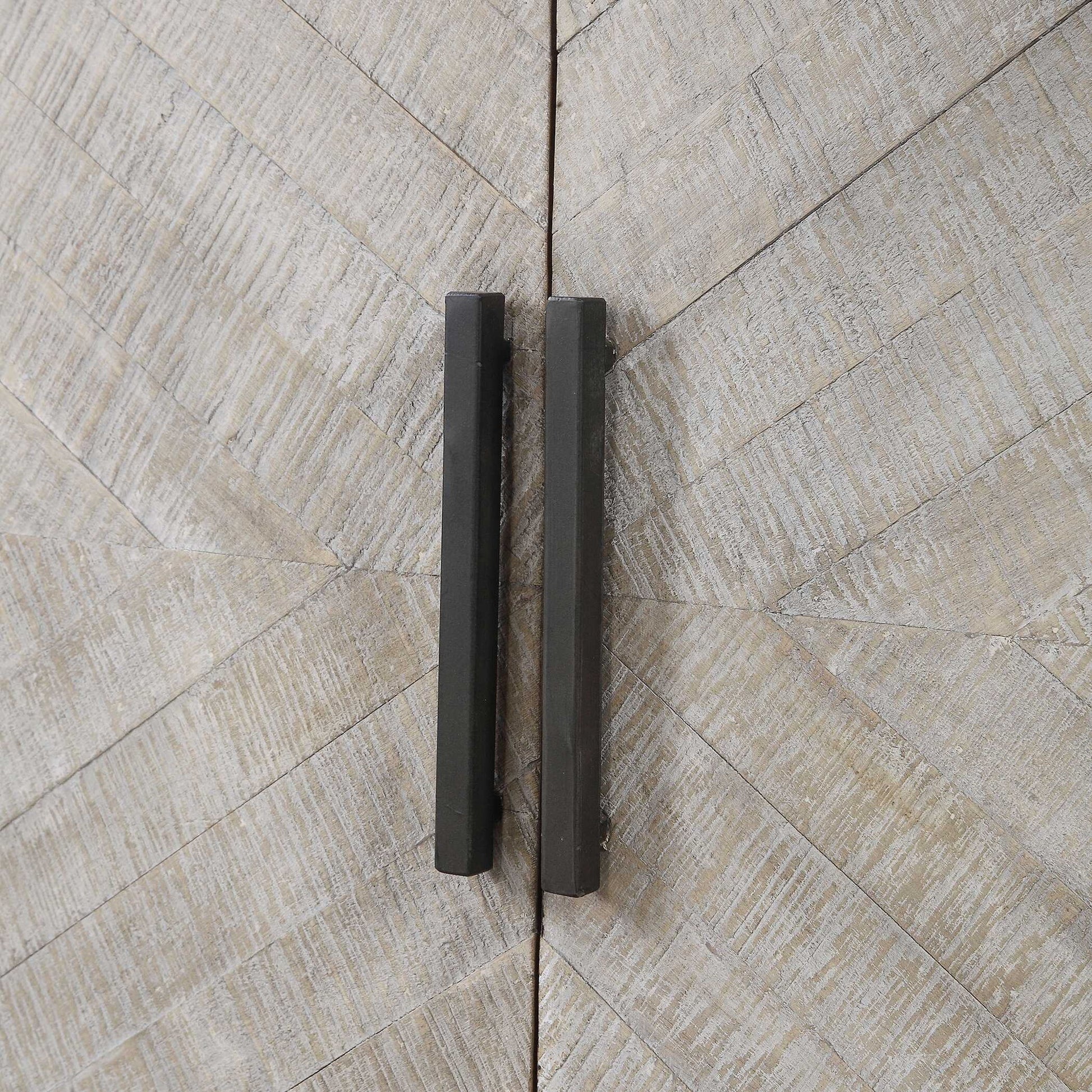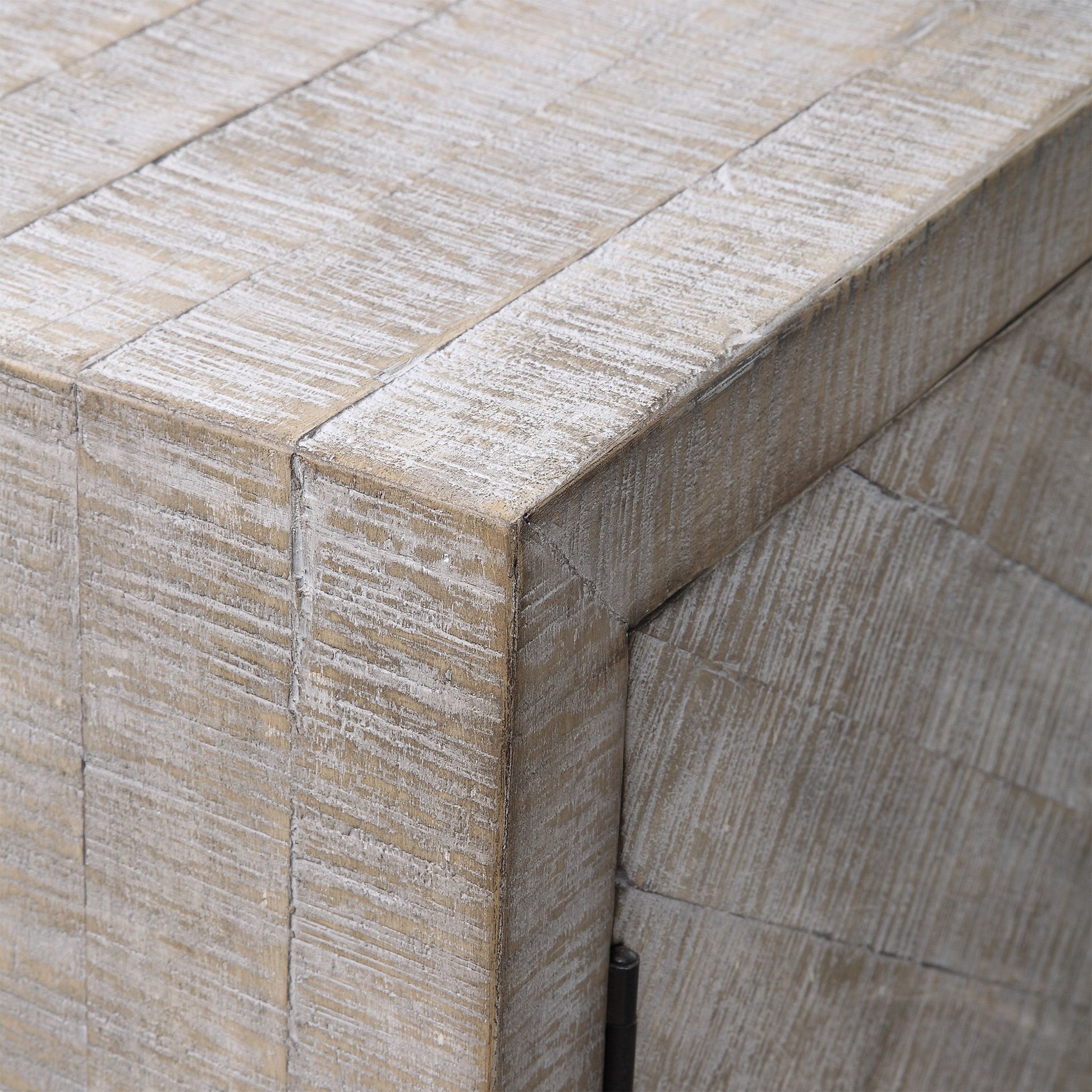 This Modern Farmhouse Two Door Cabinet Features Linear Textured Fir Wood, Finished In A White Washed Glaze With Oatmeal Undertones. Antique Bronze Iron Door Pulls Open To One Fixed Shelf.