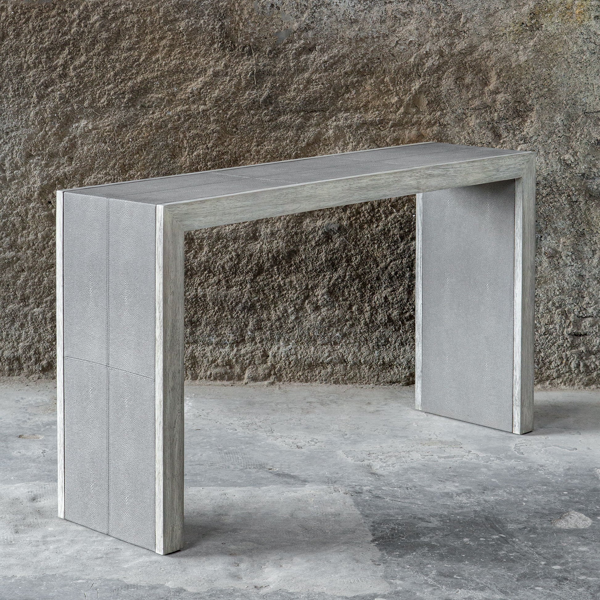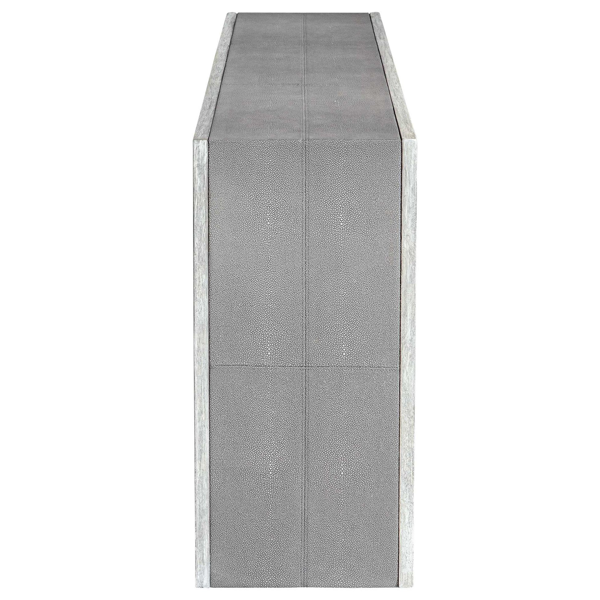 With Modern Elements, This Transitional Console Features Stitched Panels Of Light Gray Faux Shagreen, Paired With A Contrasting Wood Finish In A Aged White With Gray Distressed Details.