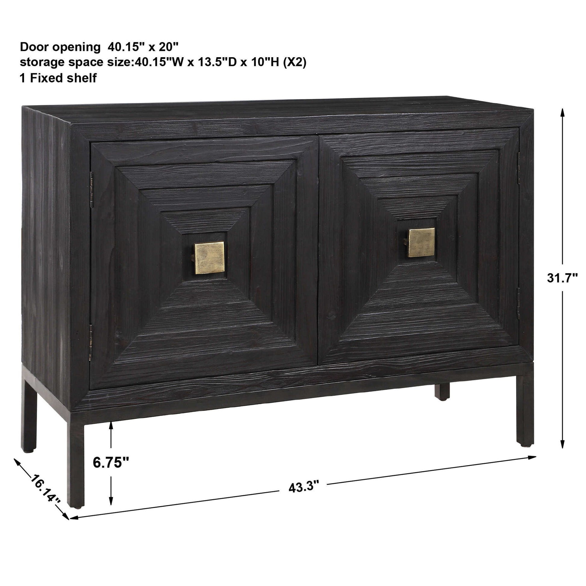 A Contemporary Geometric Two Door Accent Cabinet, Constructed From Deeply Grained Fir Wood Finished In A Dark Ebony Stain, Accented With Brushed Brass Hardware. Has One Fixed Interior Shelf.