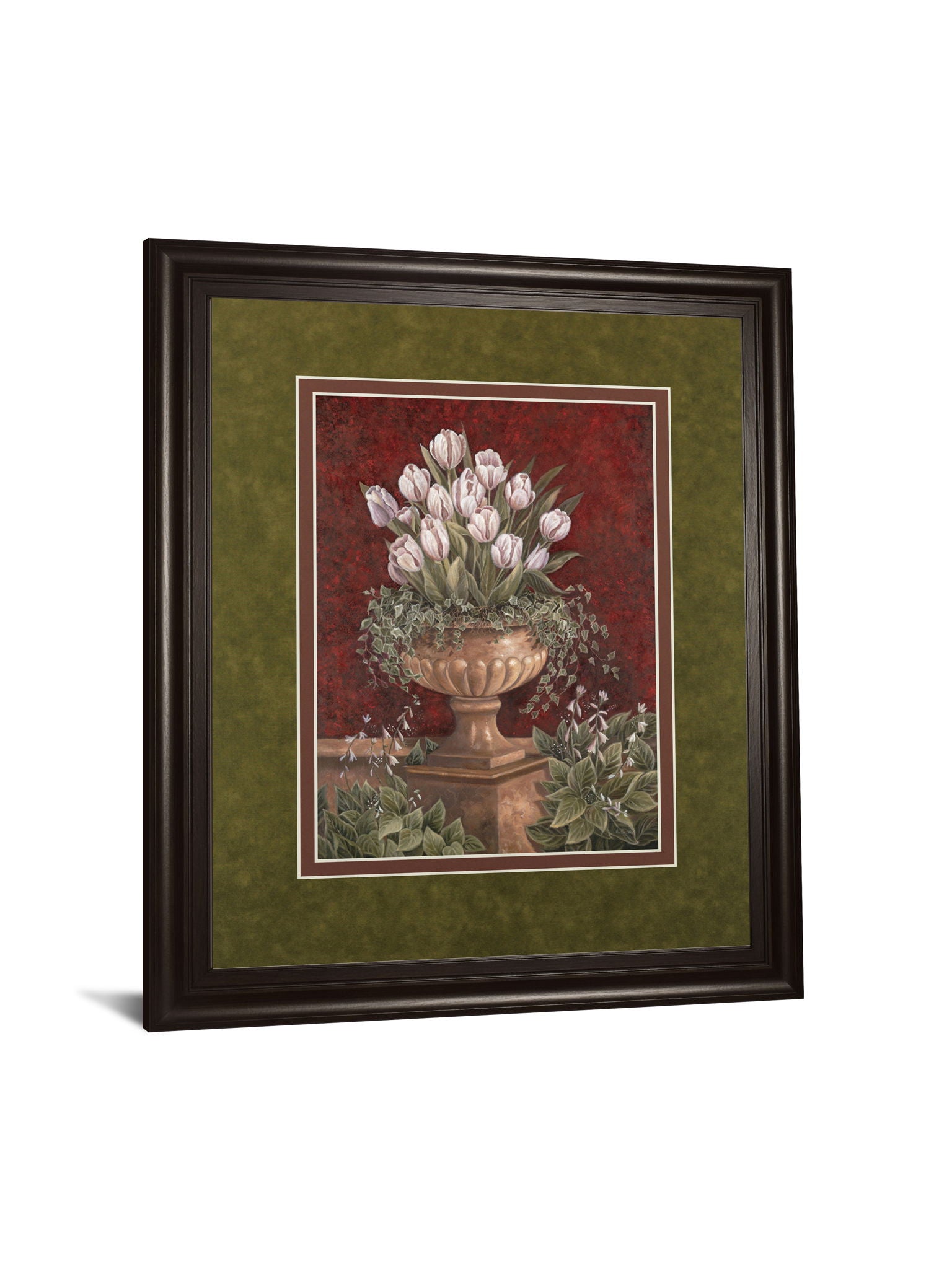 This exquisite piece showcases a graceful bouquet of soft pink tulips blooming from a classic urn, set against a rich, textured red background. Surrounded by lush greenery and framed in dark chocolate with double matting in olive green, brown, and white, it evokes the tranquility and charm of a serene garden. Perfect for adding warmth and sophistication to living rooms or offices, this framed art piece is finished with premium real glass, ensuring lasting beauty and protection.