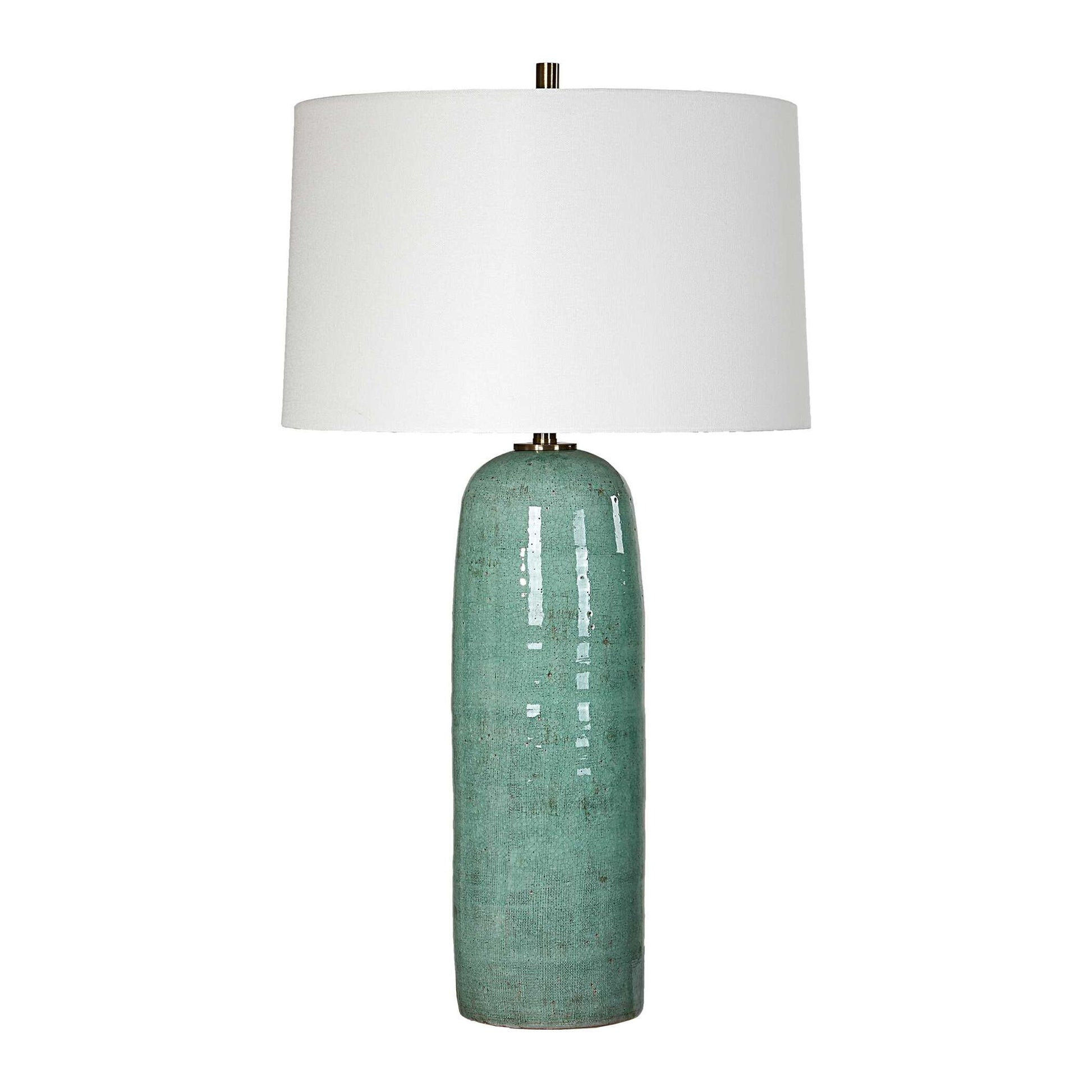 The Anadale Table Lamp Exudes A Minimalist Yet Stylish Design, Showcasing A Lightly Distressed, Crackled Teal Ceramic Base, Complemented By Plated Antique Brass Accents. The Slightly Tapered Round Hardback Shade Is In A Casual White Linen Fabric. Due To The Nature Of Fired Glazes On Ceramic Lamps, Finishes May Vary Slightly.