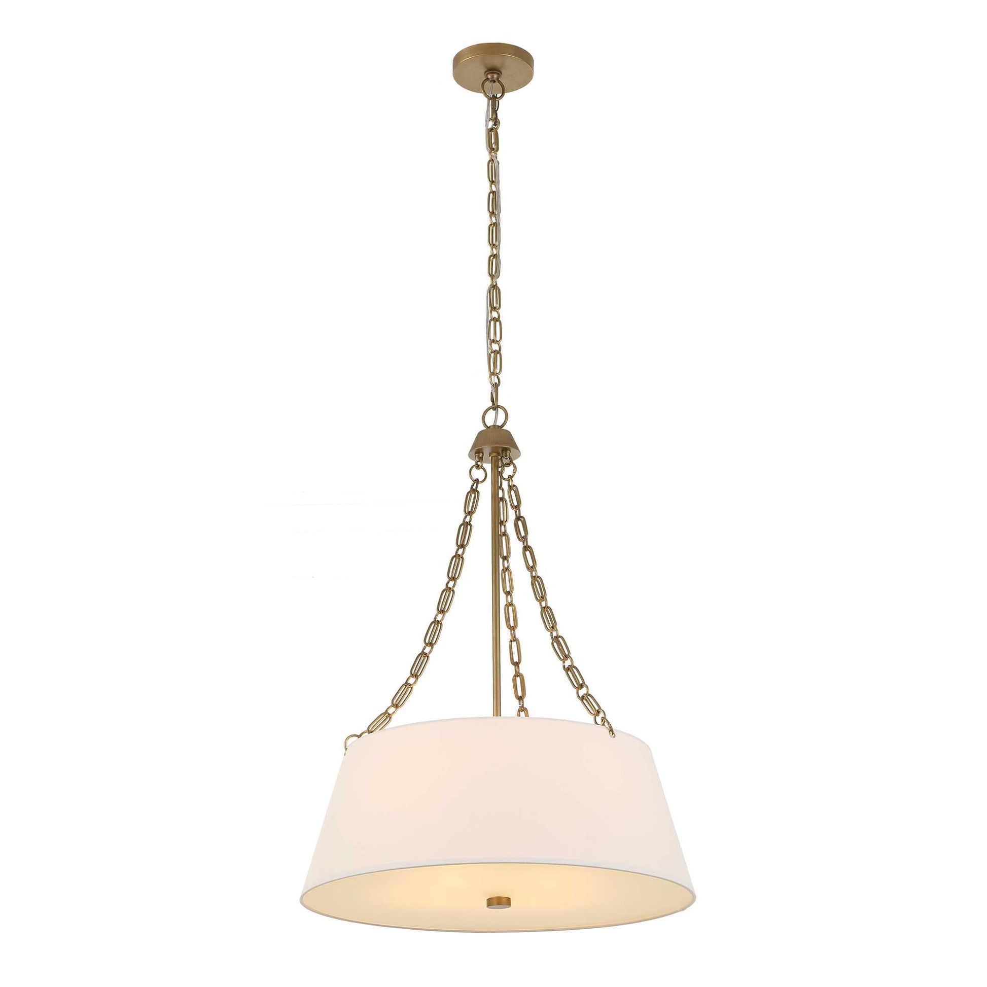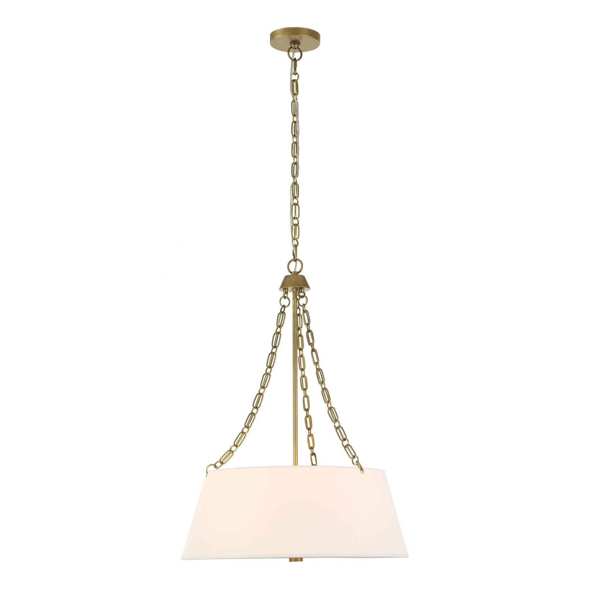 White Linen Hanging Shade With Custom Double Oval Link Chain Details Finished In A Matte Brushed Gold Finish With A Lower White Glass Diffuser. 4-60 Watt Max, Edison Sockets. Bulbs Not Included. Supplied With 15' Wire, 5' Chain For Adjustable Installation.