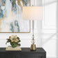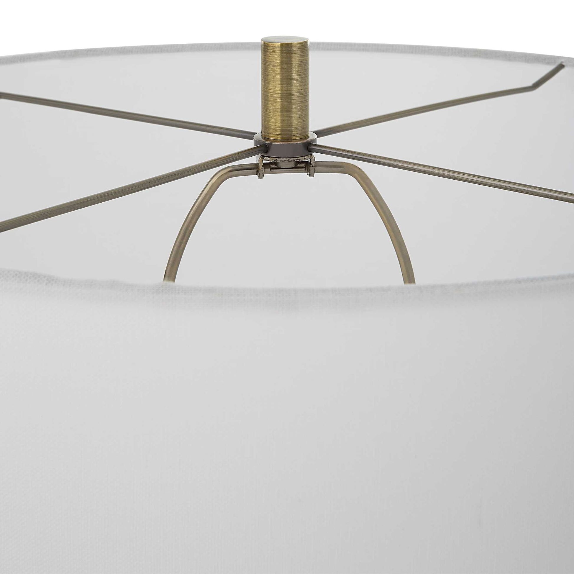This Elegant Table Lamp Features A Tapered Crystal Column, Paired With Thick Crystal Spheres, Creating A Timeless Design That's Accented With Antiqued Brass Plated Details For An Updated Appeal. The Round Drum Shade Is Covered In A Crisp White Linen Fabric.