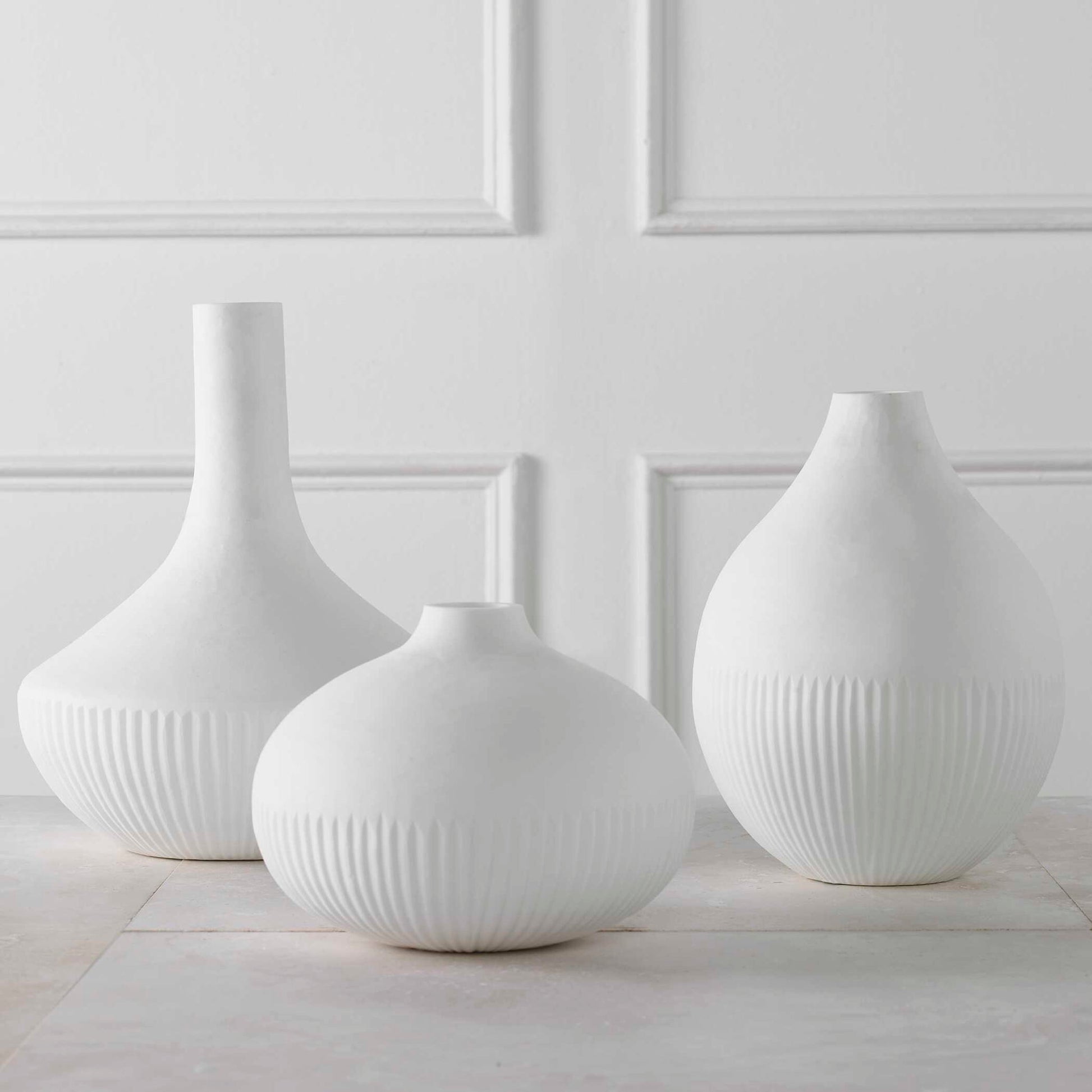 The Apothecary Vases Showcase Three Varying Curved Silhouettes Accented By Carved Details In A Satin White Finish. Sizes: S-8x6x8, M-8x11x8, L-10x12x10
