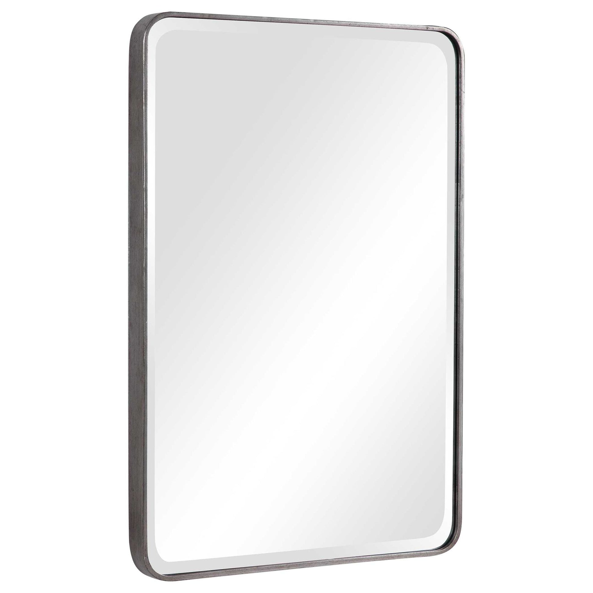 This Iron Frame Is Finished In Lightly Distressed Silver Leaf Featuring Gracefully Curved Corners, And A Generous 1 1/4" Bevel. May Be Hung Horizontal Or Vertical.