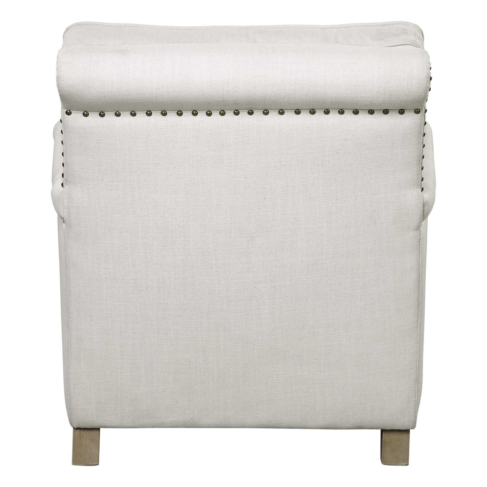 Classic Antique White English Arm Chair With Loose Box Cushions, Antique Brass Nail Head Trim And Hand Turned Legs In Distressed Honey Stain.