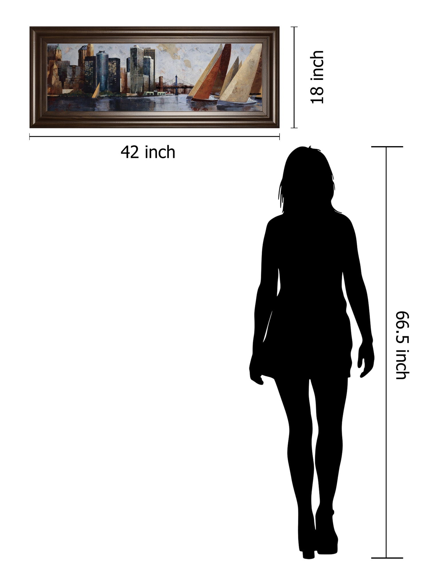 Step into the lively energy of a bustling metropolis with this captivating framed wall art, showcasing a panoramic view of Manhattan's iconic skyline and serene harbor. The artwork beautifully captures the contrast between towering skyscrapers and graceful sailboats, inviting you to imagine the stories unfolding on the water and in the city beyond. Framed in a rich, gilded finish with real glass, this piece adds a touch of elegance and urban charm to any living room, office, or study, making it a timeless tribute to the spirit of adventure and sophistication.