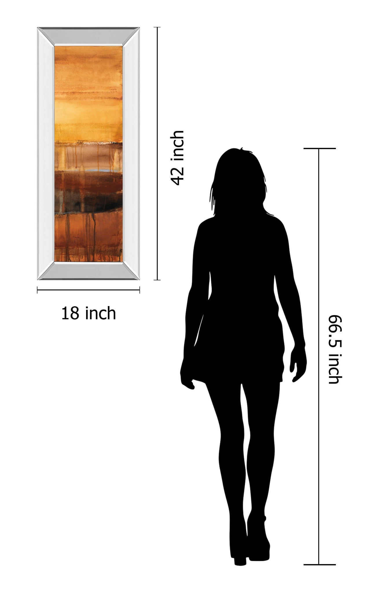 Bathe your room in the warm, inviting tones of autumn with this captivating abstract framed wall art. Rich amber, rust, and brown hues blend seamlessly with subtle hints of blue and black, evoking the golden light of fall landscapes. The sleek mirrored frame adds a modern touch, reflecting light and enhancing the depth of the mixed media artwork. Crafted with premium real glass, every detail and color comes to life, making it a striking centerpiece for living rooms or offices. This vertical piece is ready to hang and designed to bring a sophisticated, transitional style to your décor, infusing your space with warmth and elegance.
