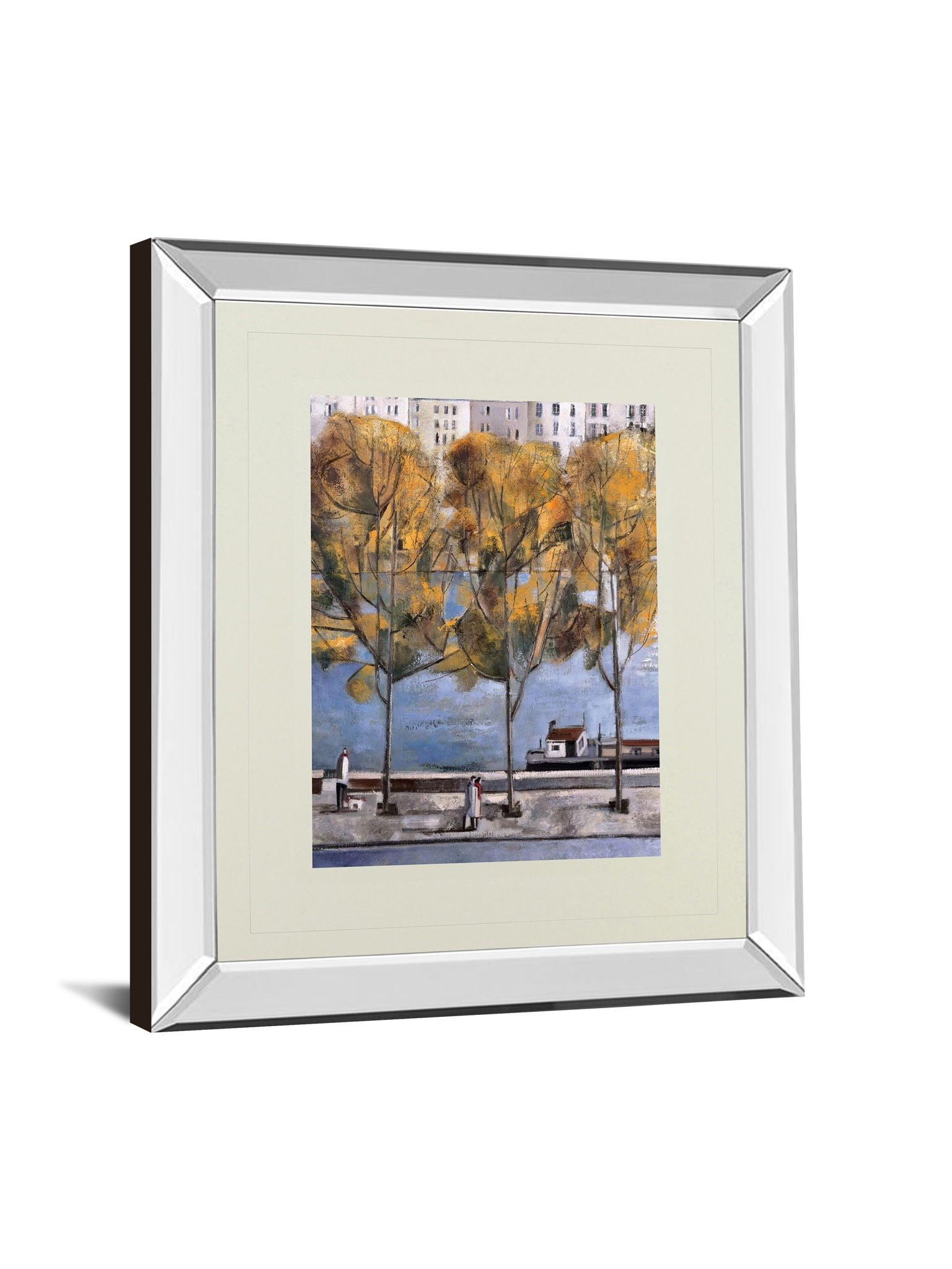 Step into the gentle embrace of a Parisian autumn with this captivating framed wall art. The scene unfolds along a tranquil riverbank, where golden fall trees stand tall against a backdrop of softly muted city buildings. The 2.5-inch mirrored frame adds a modern touch, reflecting light and deepening the artwork's warm, inviting hues. Double-matted in cream, the piece offers a refined gallery finish, while premium real glass preserves every detail and vibrant color. Sized at 34 by 40 inches, it’s an ideal statement for living rooms, offices, or bedrooms seeking a blend of cozy charm and sophisticated style. This artwork invites you to bring a slice of serene Parisian beauty into your everyday space.