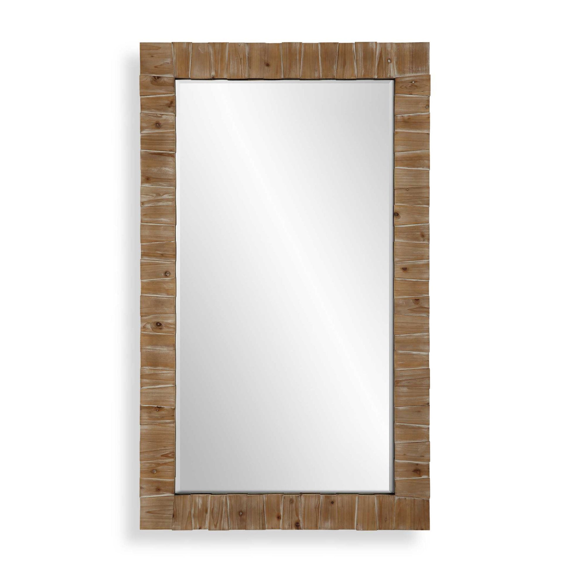 Perfect Addition To Any Coastal Cottage, This Oversized Mirror Features Overlapped Slabs Of Solid Fir Wood Creating An Alternating Pattern, Accented With A Subtle Light Gray Wash. Mirror Has A Generous 1 1/4" Bevel. May Be Hung Horizontal Or Vertical.