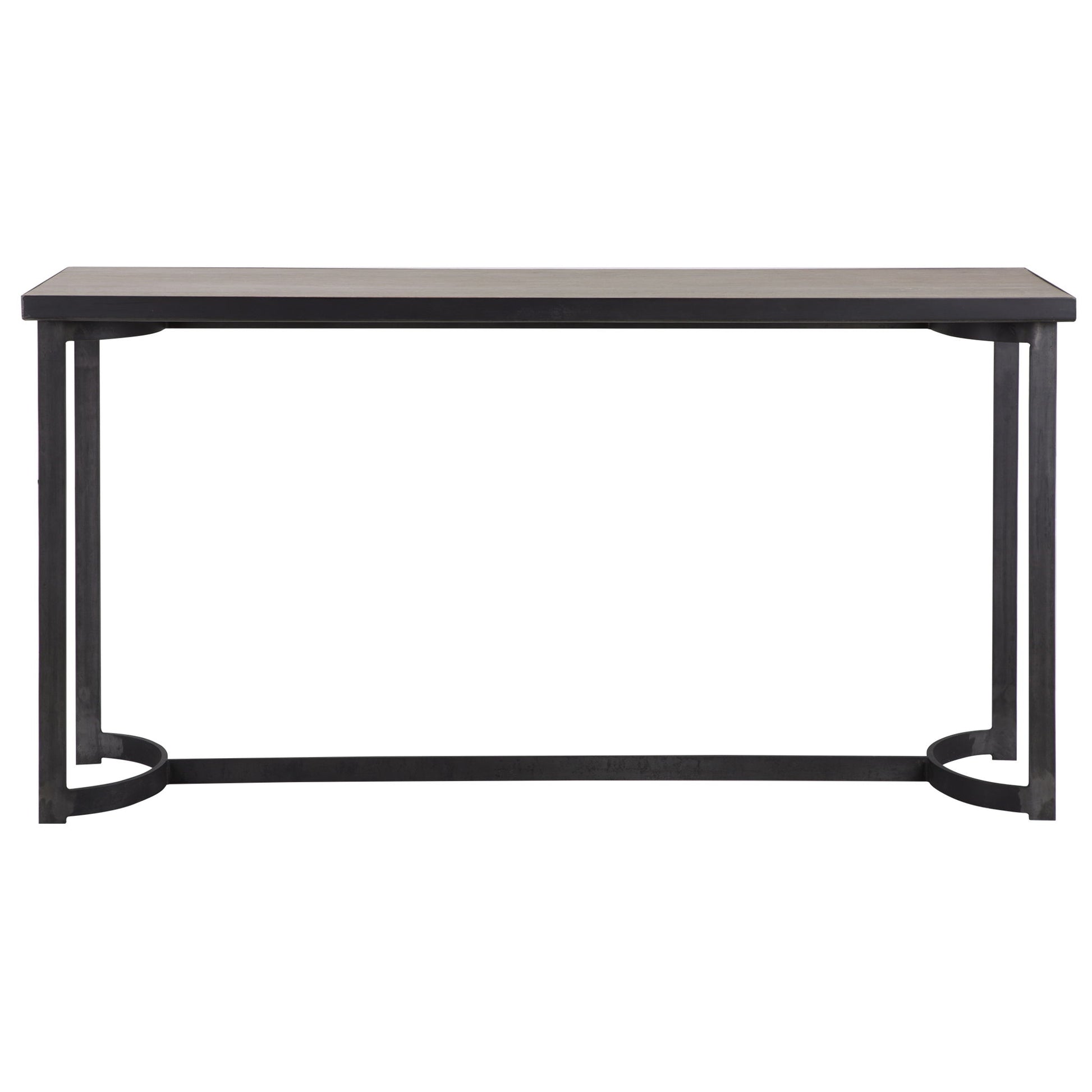 Evoking A Modern Lodge Style, This Clean Lined Console Showcases A Natural Oak Veneer Top Finished In A Light Gray, Paired With A Curved Hand Forged Iron Base In Aged Steel With Natural Burnishing.