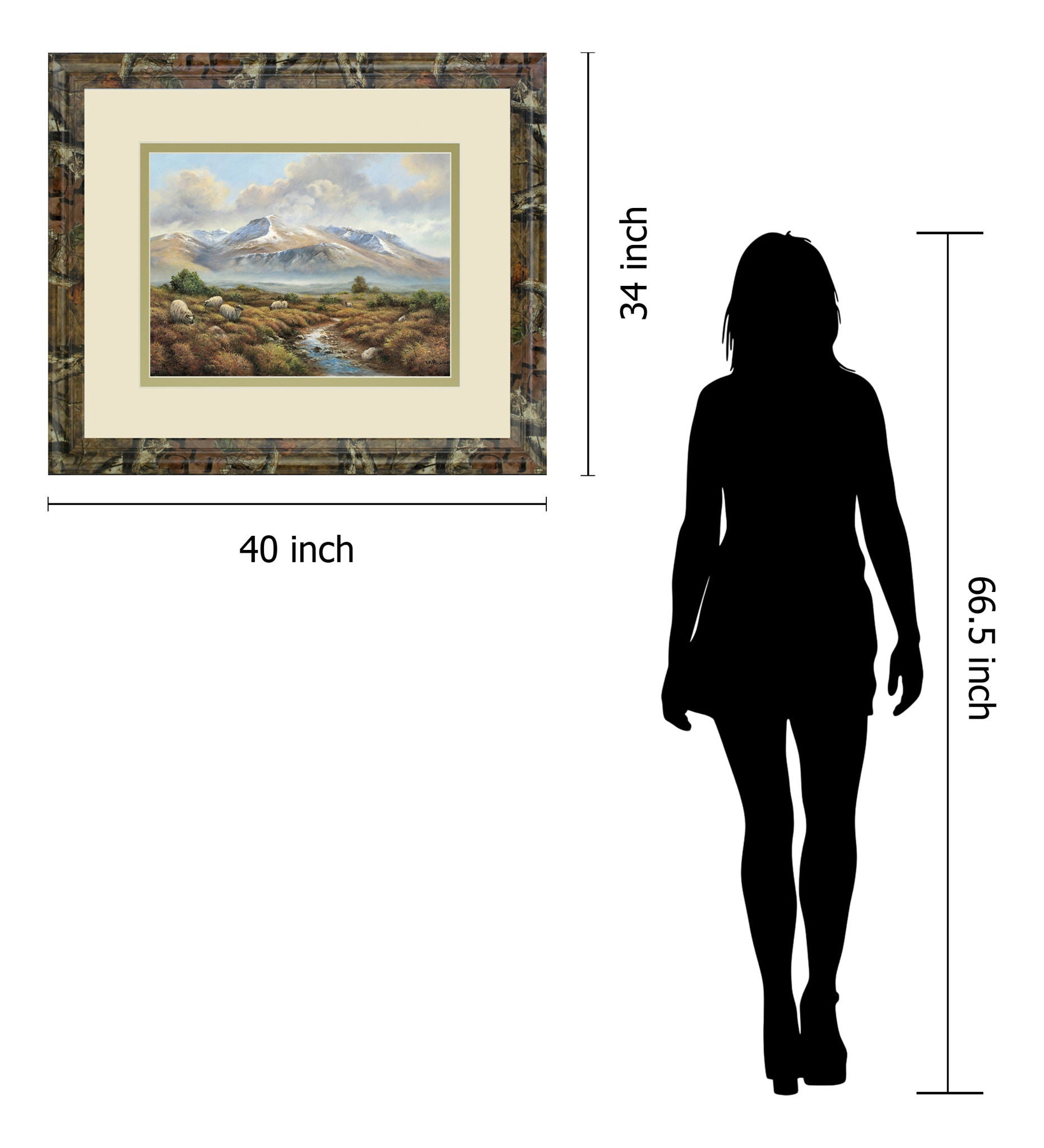 Step into the tranquil Scottish Highlands with this captivating scene that brings nature's peaceful beauty right into your home. Soft clouds drift above majestic snow-capped peaks, while gentle sheep graze beside a winding stream that meanders through lush, earthy foliage. The layered cream and olive mats enhance the depth of this serene landscape, all embraced by a distinctive camouflage frame that adds rustic charm. This artwork invites you to pause and breathe, offering a perfect retreat for your living room, office, or den where calm and natural splendor can be savored every day.