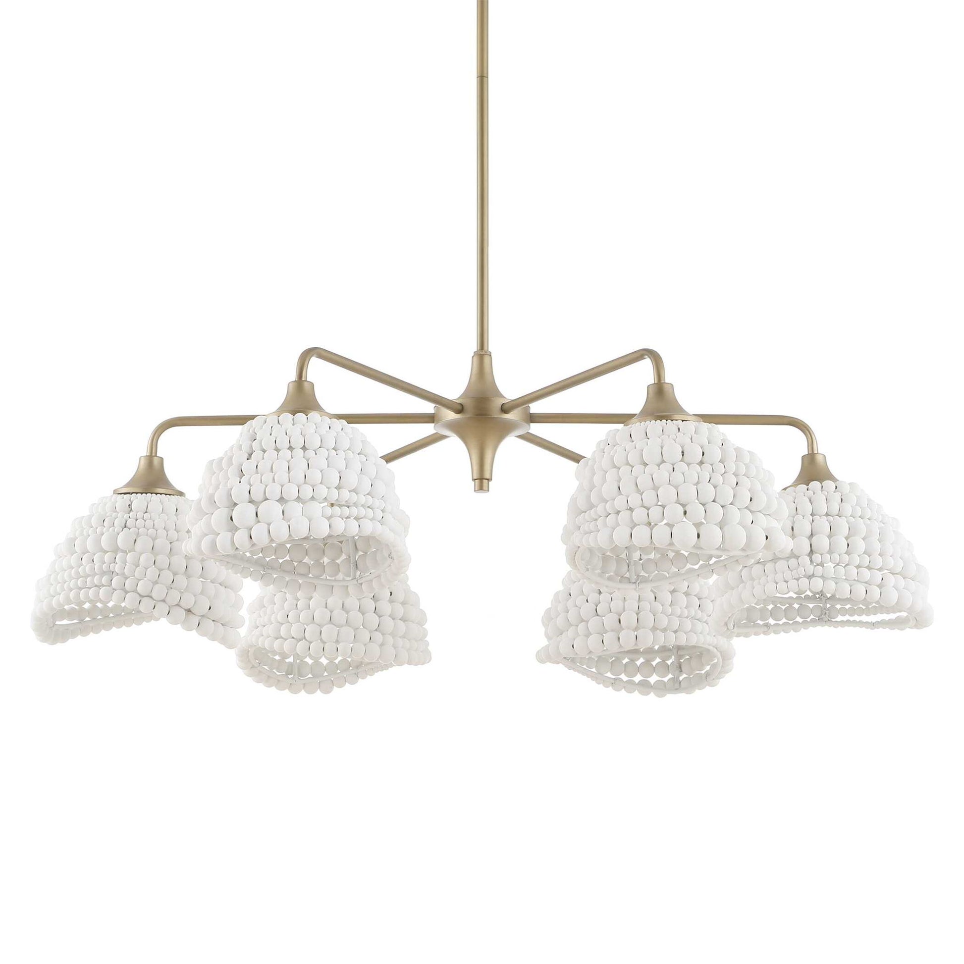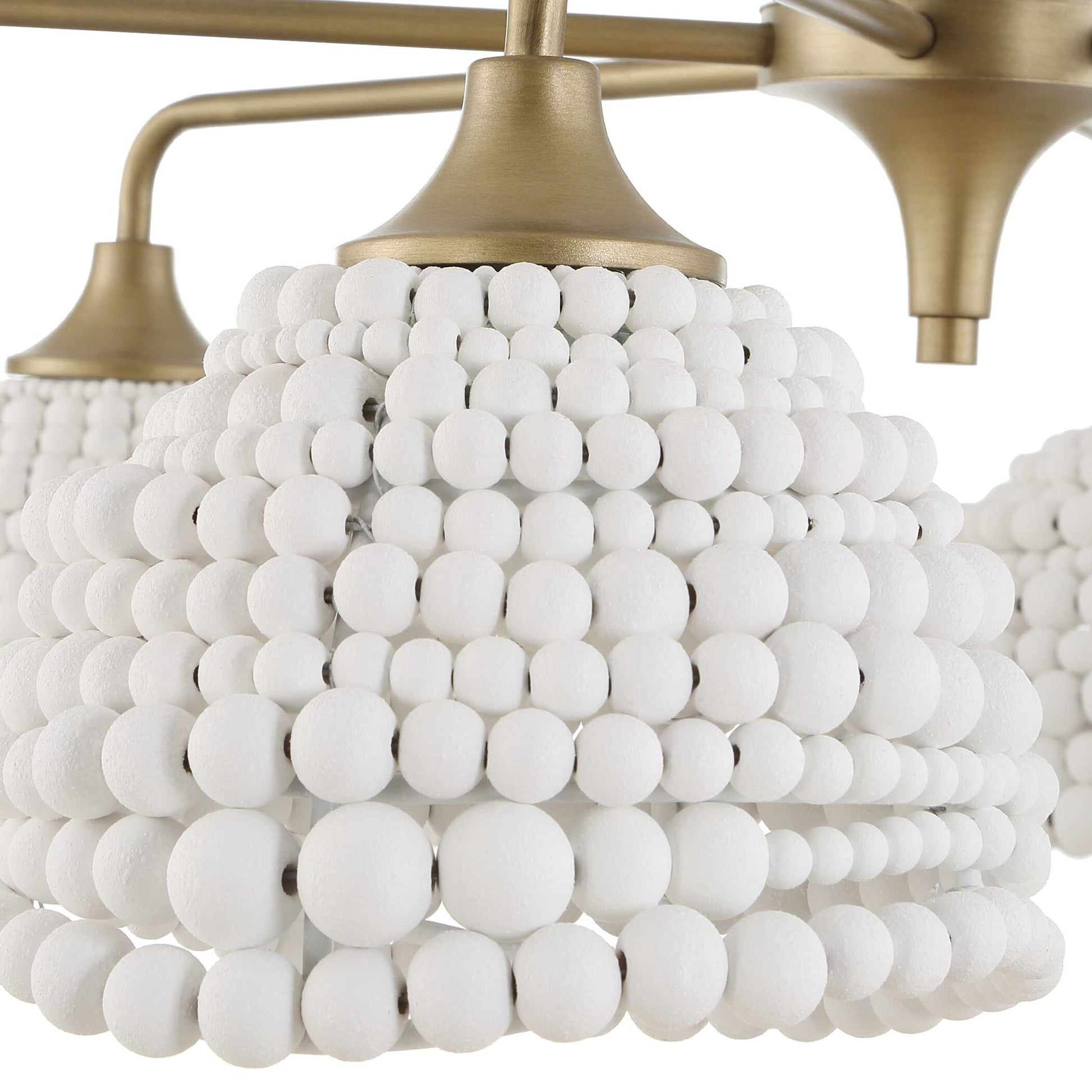 Our Refreshing 6 Lt. Pendant Features 6 Scalloped Shades Made Up Of A Variety Of 7 Sizes Of Intermingled Matte White Wood Beads Completed With A Brushed Matte Gold Finish Giving An Airy Inviting Feeling To Any Interior. 6-60 Watt Max Edison Sockets. Bulbs Not Included. Supplied With 15' Wire, 3-12" Stems And 1-6" Stem For Adjustable Installation.