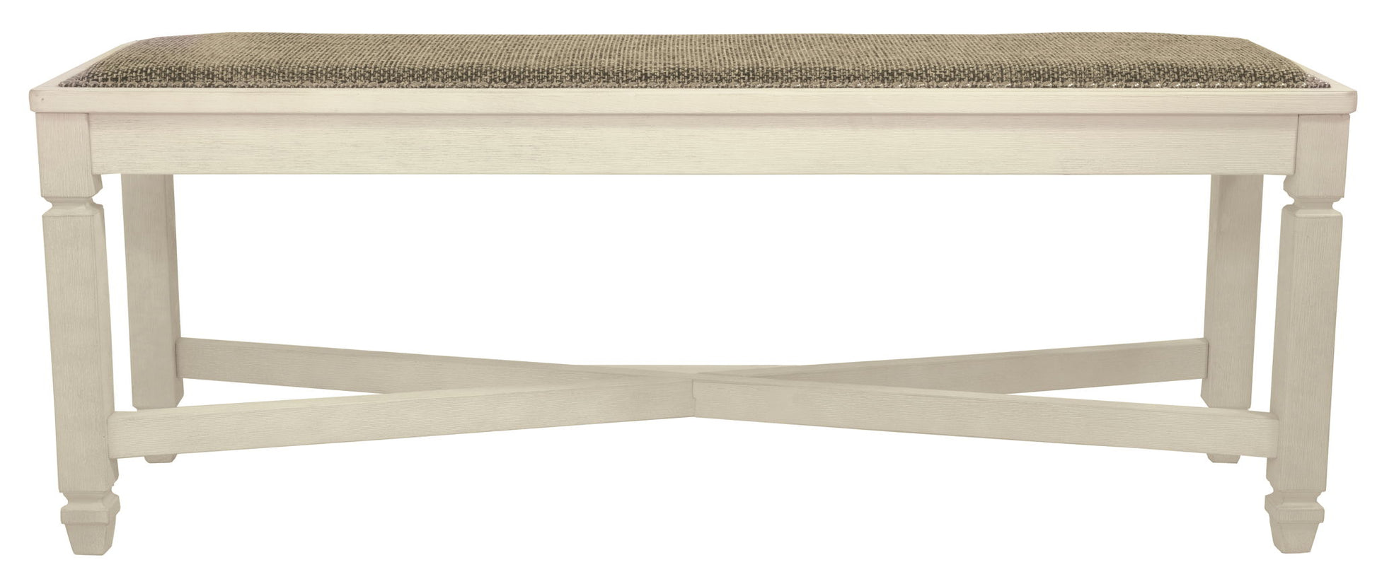 The beauty of this upholstered dining bench is something to savor. Serving up comfort and flair, this generously scaled bench entices with a cushioned seat covered in a heavy woven fabric that complements the antiqued white finish.