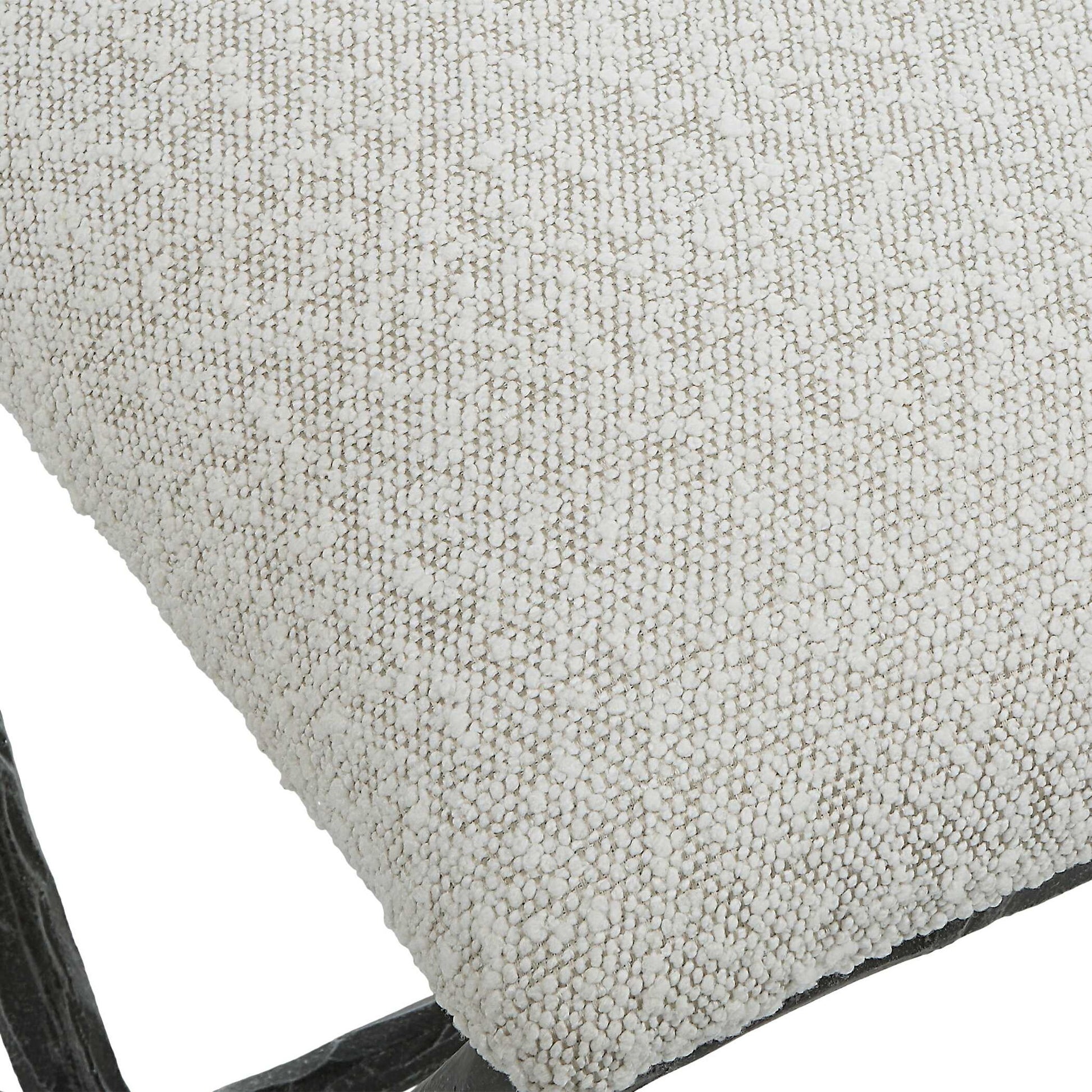 With Clean Contemporary Lines, This Cast Iron Base Features A Chiseled Texturing With A Distressed Charcoal Finish. Topped With An Upholstered Seat In A Casual Ivory And Light Gray Boucle Fabric.