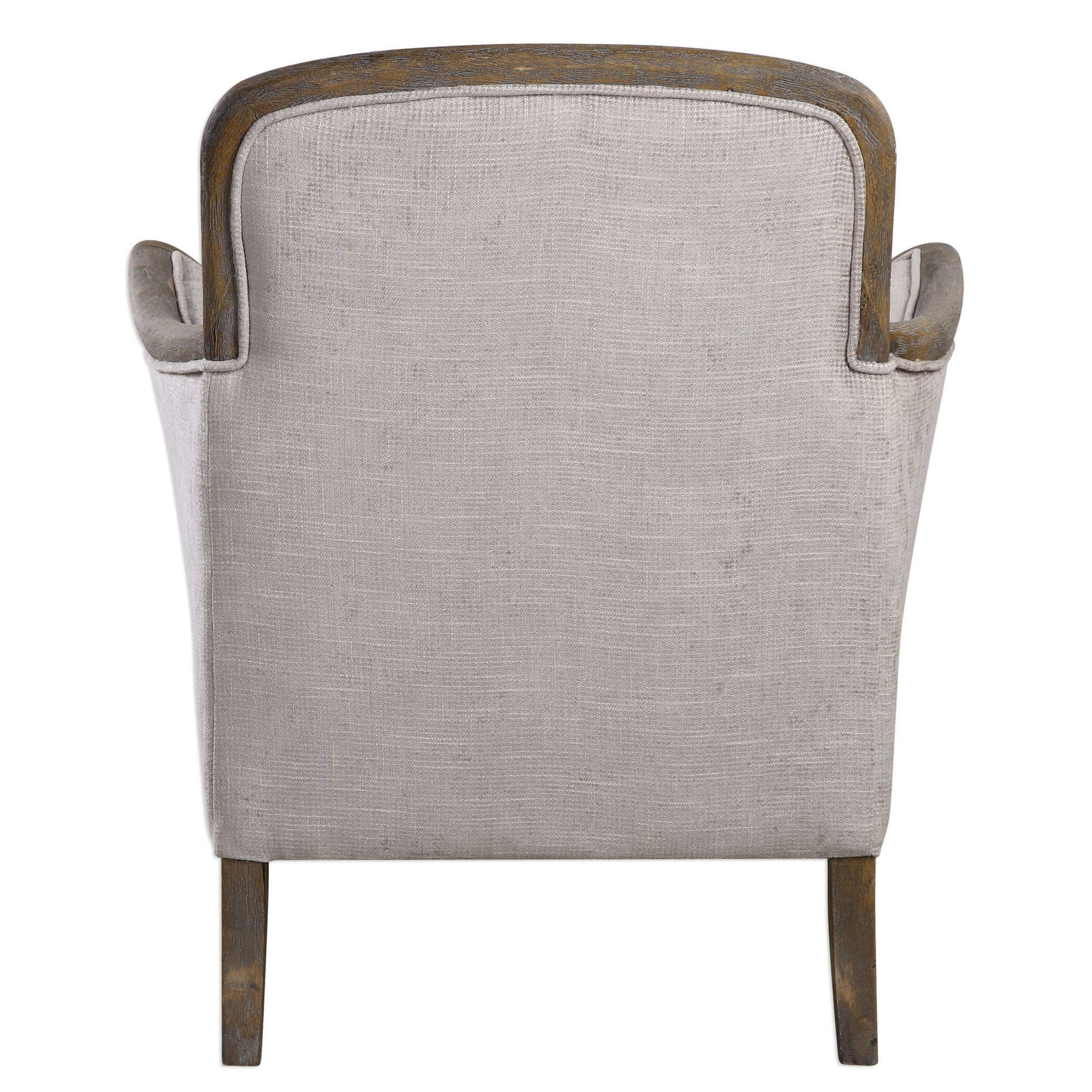 Solidly Constructed Chair Featuring Exposed Hardwood Finished In A Weathered Pecan And Tailored In Soft And Woven Shades Of Taupe And Stone. Welting Adds To The Elegance Of Its Shape Amplifying Fluid Lines All The Way Down To The Tapered Legs.