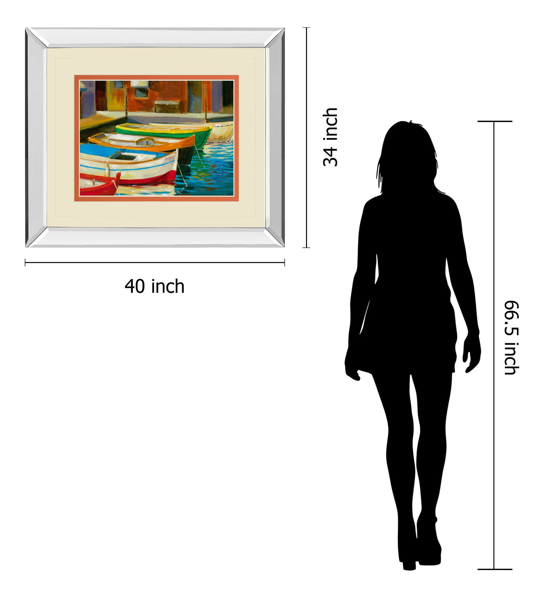 Step into a serene coastal moment with this captivating framed wall art that showcases a vibrant harbor scene. The colorful boats, painted in warm reds, blues, greens, and oranges, rest gently on shimmering waters, inviting a sense of calm and relaxation. Enhanced by a sleek mirrored frame and double matting in cream and orange tones, this piece adds depth and modern elegance to any living room or office. Crafted with premium real glass, it protects the intricate details and vivid colors, making it a polished, gallery-quality addition that effortlessly elevates your space with transitional style.
