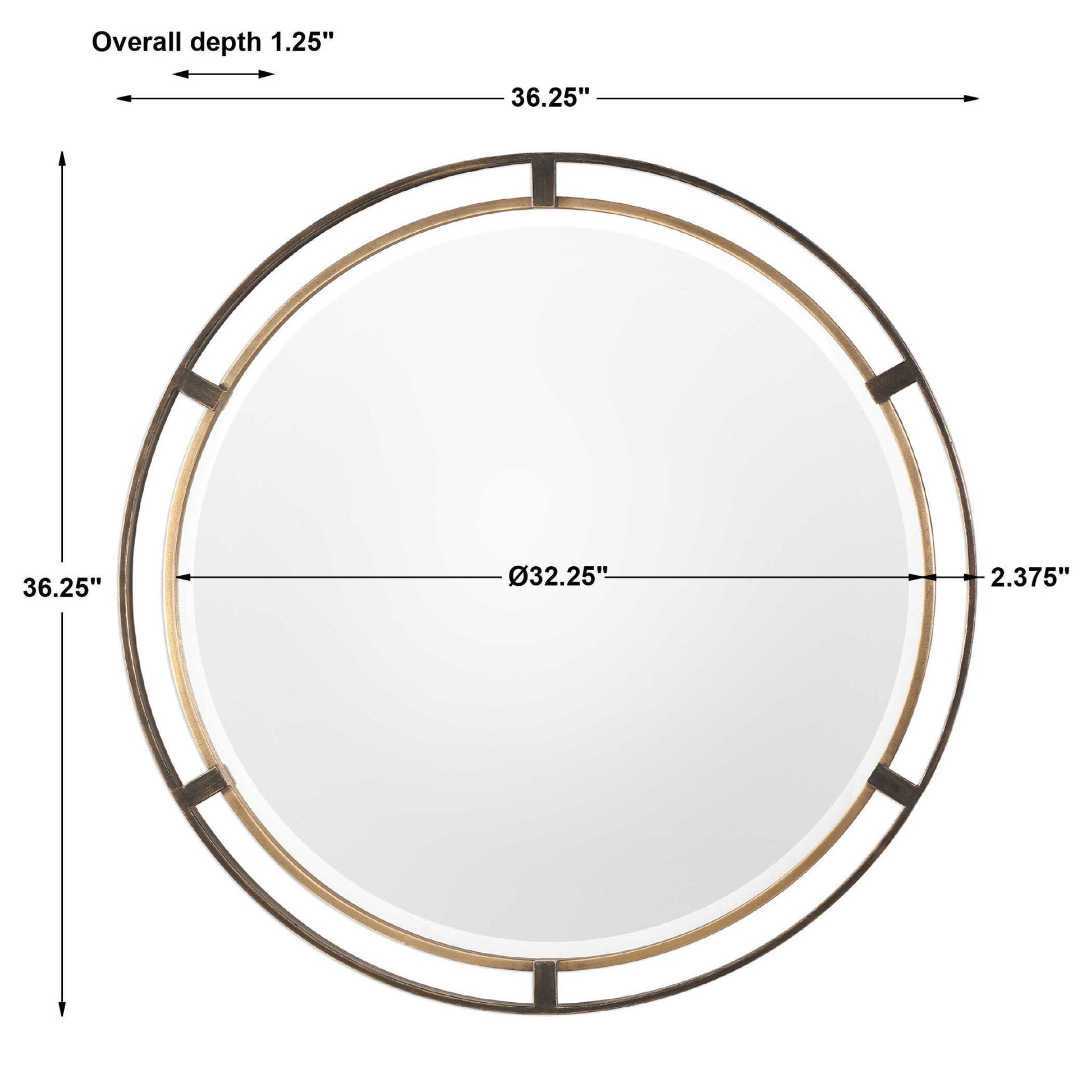 This Iron Frame Features A 3-dimensional Design With An Outer Overlapping Frame Finished In A Distressed Rustic Bronze, Accented With A Lightly Antiqued Gold Center. Mirror Features A Generous 1 1/4" Bevel.