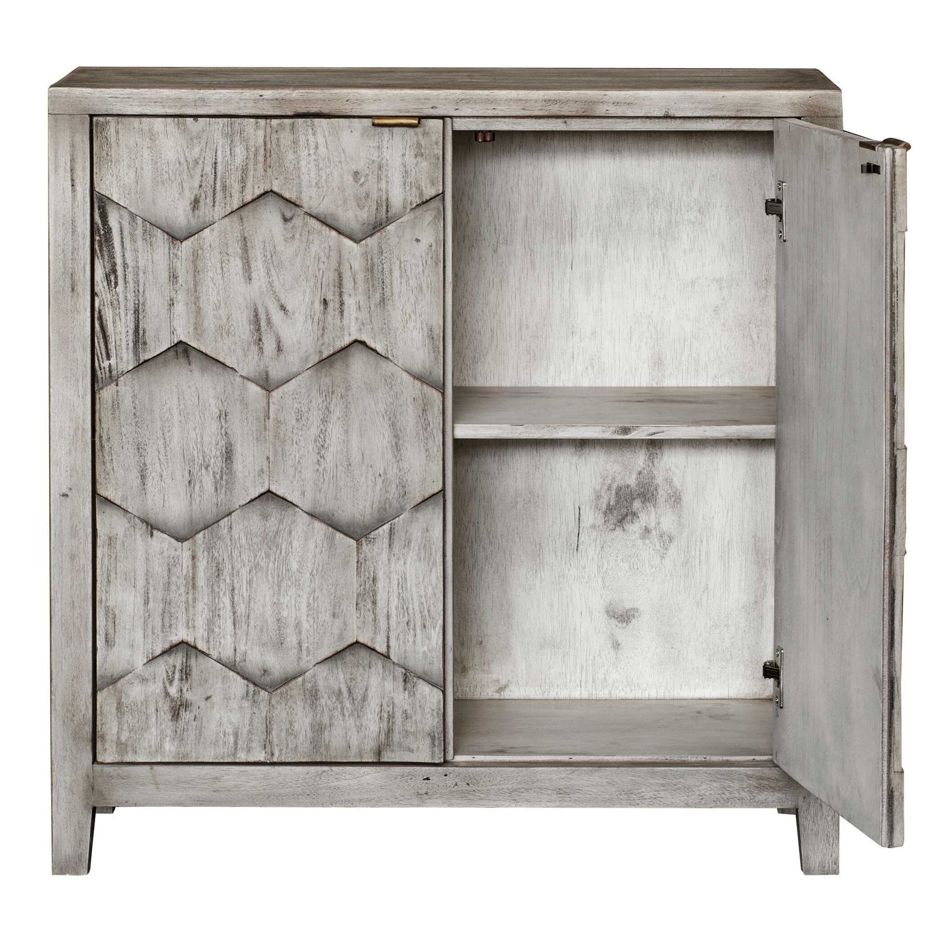 Expert Craftsmanship Is Displayed In The 3-dimensional Honeycomb Striped Doors In Smoked Ivory Finished Mahogany Wood With Antique Bronze Iron Handles. Includes One Adjustable Interior Shelf.