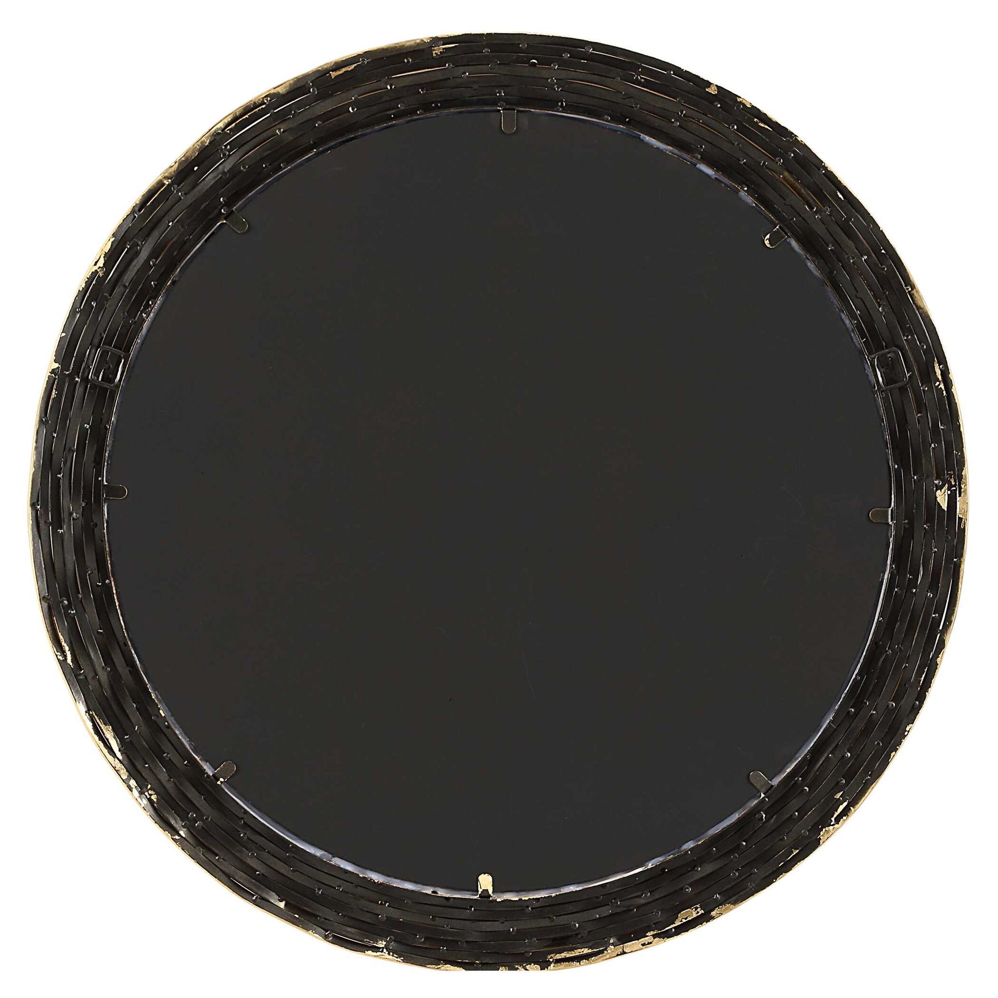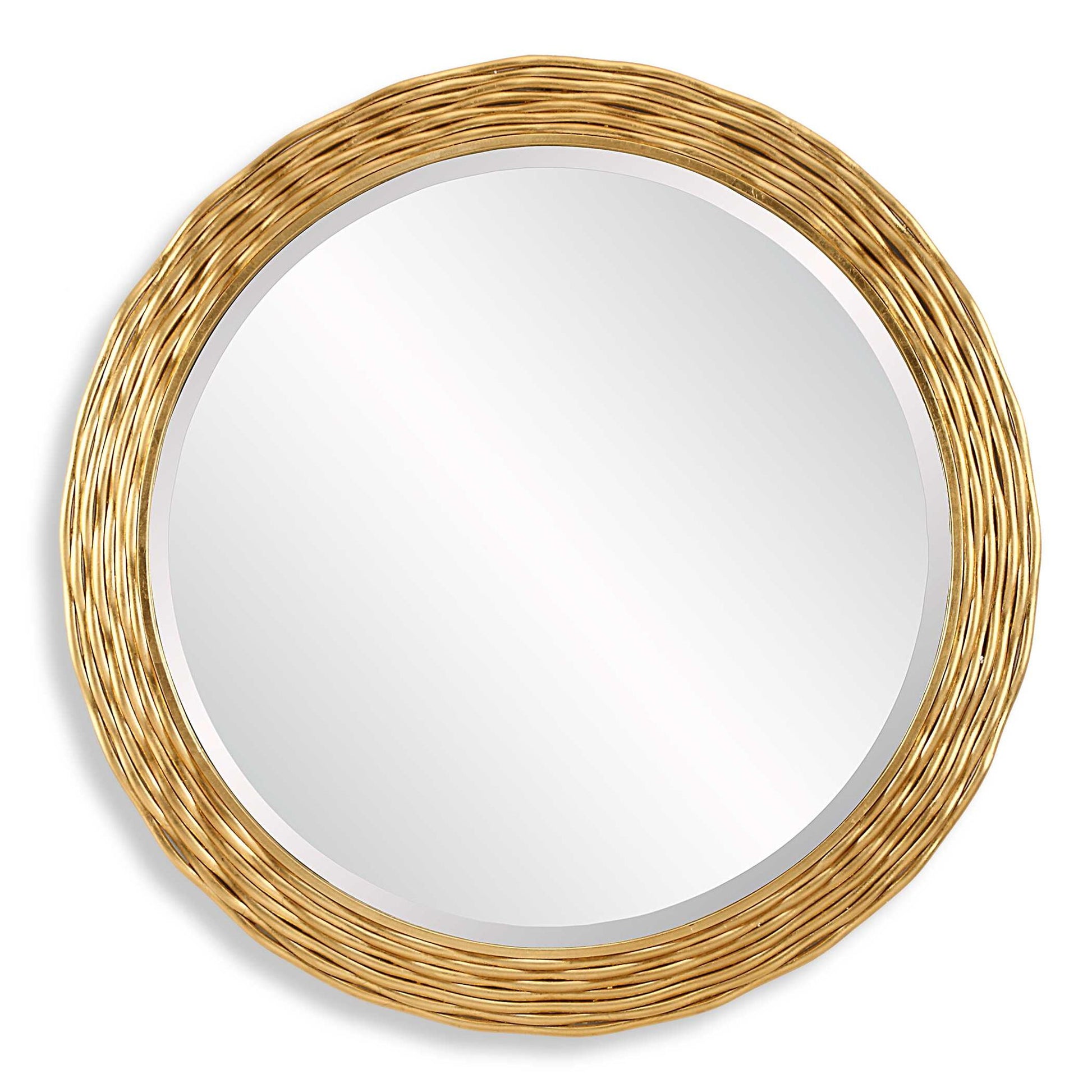 Our Celeste Round Mirror Is Crafted With Layered Iron Rods Meticulously Hand-forged To Create A Graceful, Alternating Wavy Texture. This Unique Design Exudes A Soft Yet Industrial Elegance, Finished In A Lightly Antiqued Gold Leaf. Mirror Has A Generous 1 1/4" Bevel.