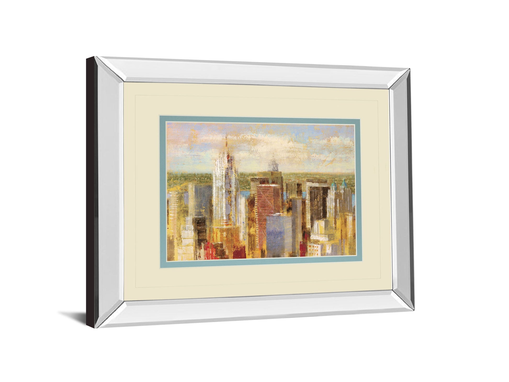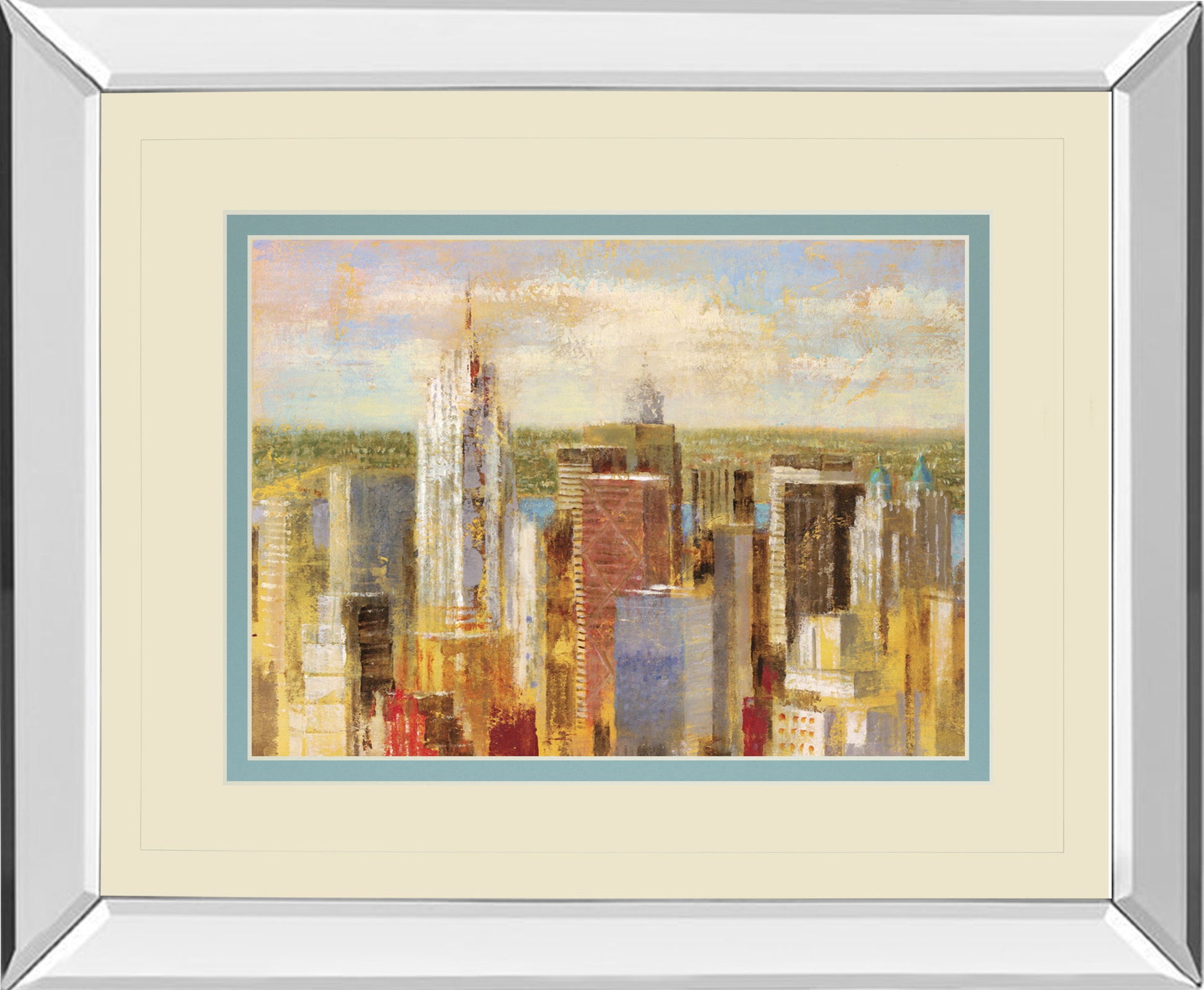 Step into the vibrant heart of the city with this captivating Urban Glow framed wall art. The mirrored frame adds a sleek, modern edge that reflects light and space, enhancing the artwork's depth and allure. Featuring a double-matted design in soft cream and blue tones, it beautifully complements the warm, textured cityscape rendered in rich hues of yellow, red, and brown. Protected by real glass, the print’s intricate architectural details and vivid colors remain crisp and radiant. Perfectly sized for a living room or any transitional space, this piece effortlessly brings sophisticated urban charm and dynamic energy to your home décor.