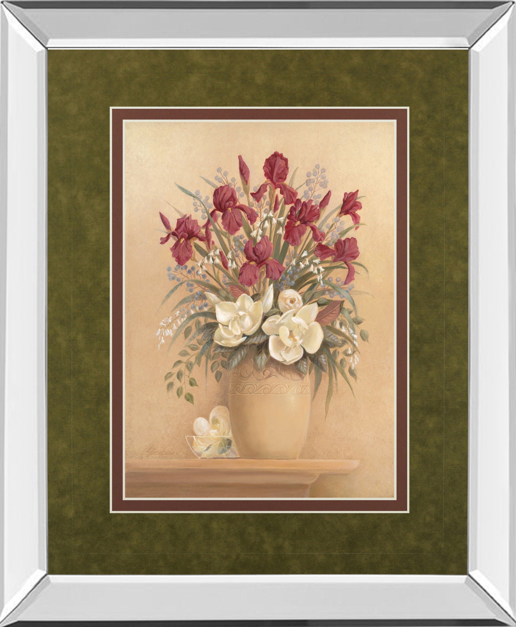 Classic Petal I captures the timeless beauty of a lush floral arrangement featuring deep red irises and creamy white magnolias resting elegantly in a softly textured vase. The artwork is enhanced by a sleek 2.5-inch mirrored frame that adds a modern reflective dimension, while the double mat in rich earth tones provides a refined gallery-style finish. Protected by premium real glass, this piece ensures lasting vibrancy and clarity, making it a sophisticated addition to any living room, bedroom, or office. Ready to hang, it effortlessly elevates your décor with its harmonious blend of classic charm and contemporary style.
