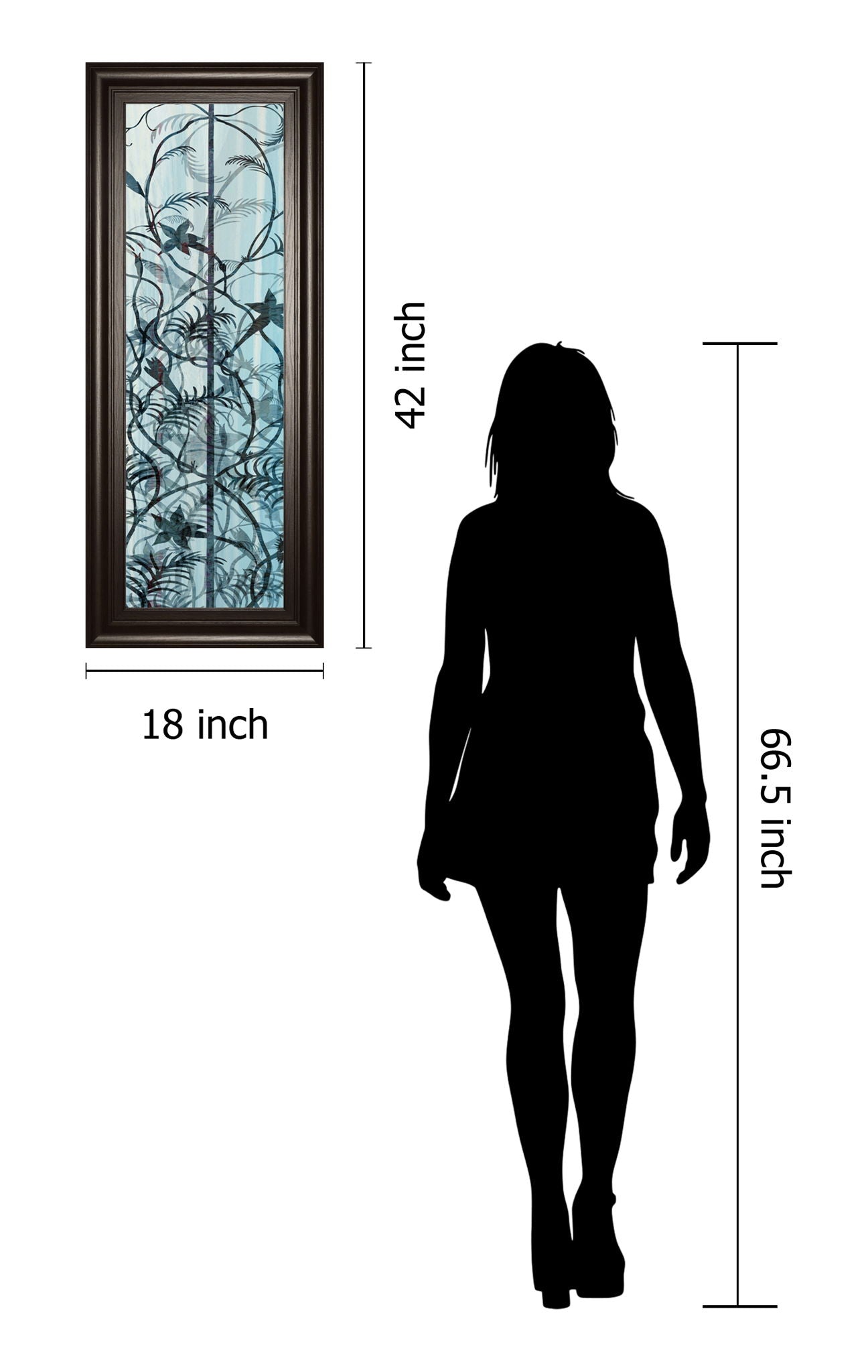 This captivating piece draws you into a serene world of climbing vines and delicate leaves, rendered in soothing shades of blue, black, and gray. The intricate layering of botanical forms creates a sense of depth and tranquility, evoking the peacefulness of a quiet garden. Set within a rich dark chocolate frame, the artwork's premium glass enhances the vibrant colors while offering protection, making it a refined addition to living rooms, bedrooms, or offices. Expertly crafted in the USA and arriving ready to hang, this vertical composition blends natural beauty with sophisticated style, perfect for elevating transitional décor.