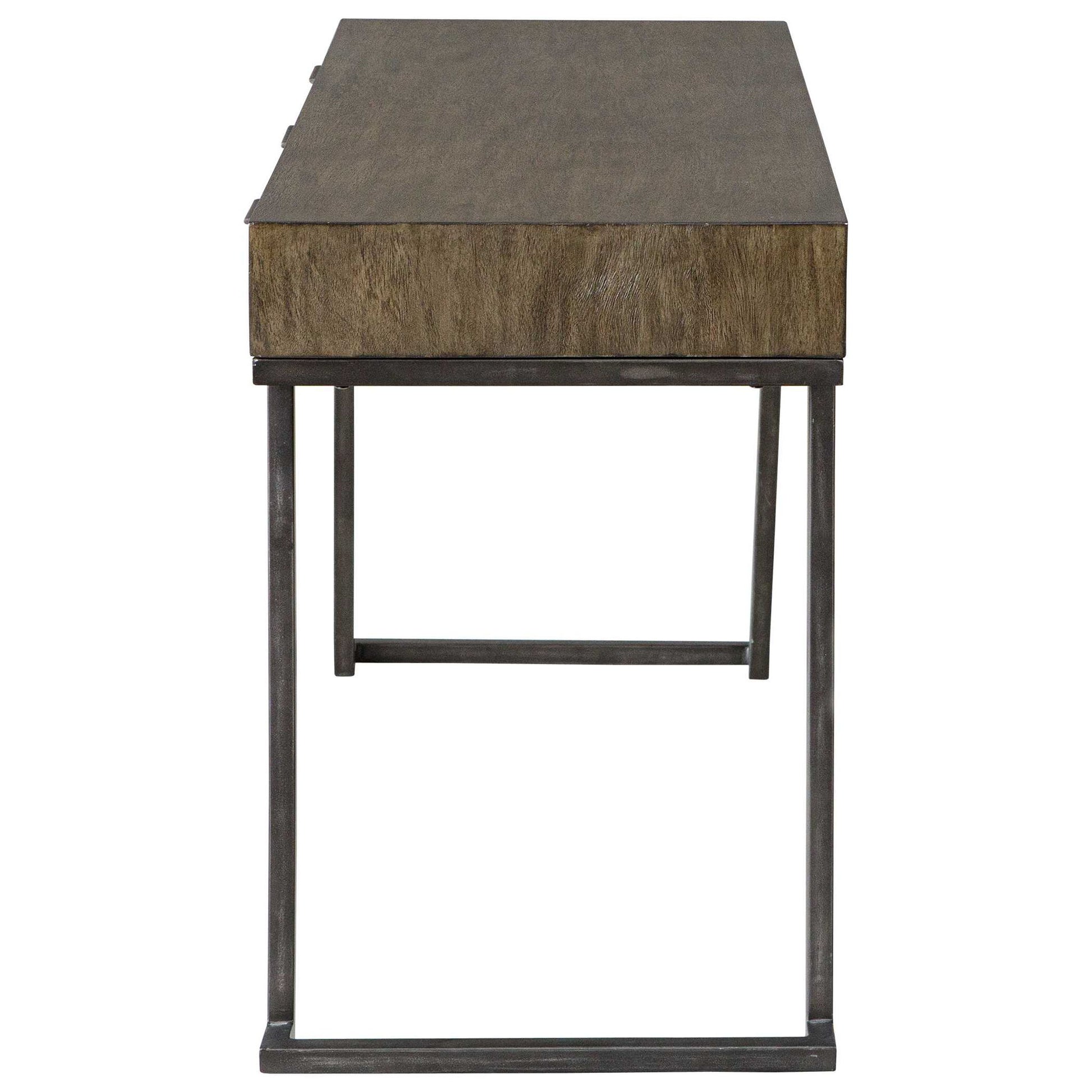 The Comrade Desk Provides A Perfect Spot For Ample Productivity. The Desk Is Finished In A Mango Wood Veneer With Light Gray Glazing And Natural Wood Undertones, Supported By A Metal Base In Aged Steel. Features Three Drawers With Coordinating Metal Tab Drawer Pulls.