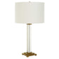 Clean Lines Define This Simplistic Design Featuring An Upscale Square Column Crystal Base Paired With Antique Brass Plated Details. The Square Shapes Of The Base Switch To A Petite Round Neck, Finial And Drum Shade In A Crisp White Linen Fabric.