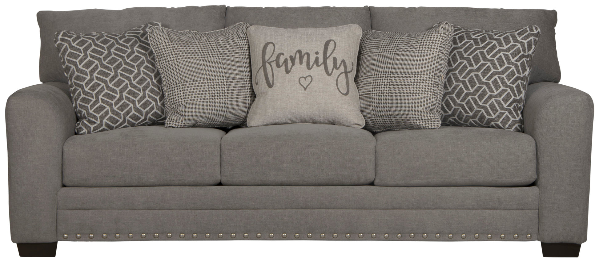 The contemporary farmhouse styling of the Cutler Sofa brings comfort and style to any room. Built for comfort, the seats are constructed of individually pocketed coils encased in foam and topped with a layer of cool gel infused memory foam for a long lasting, comfortable and supportive seat. Covered in a soft, durable 100% polyester body fabric in a light gray color and accented with coordinating designer toss pillows, the Cutler brings style to any room. The look is completed with pewter finished nailhead accents along the base.