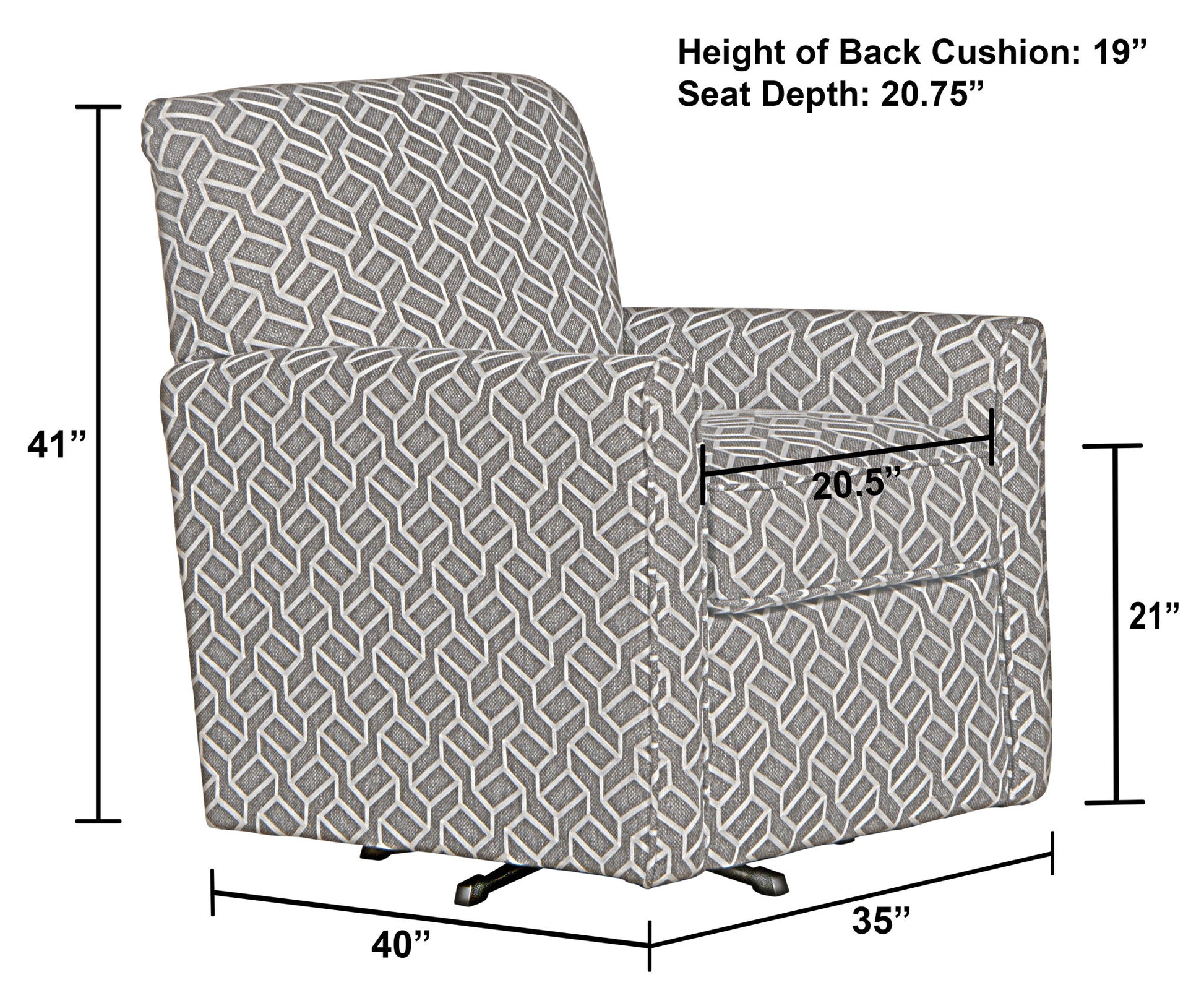 The Cutler swivel accent chair is great as a stand alone accent or in conjunction with the Cutler sofa, loveseat, chair and cocktail ottoman. The seating is constructed with individually pocketed coils encased in foam, topped with a layer of cool gel infused memory foam and wrapped in a layer of synthetic fiber. This creates a comfortable and supportive seat that will last much longer than traditional foam only seating. The 360 degree swivel base allows you to easily rotate the seat to always be a part of the conversation.