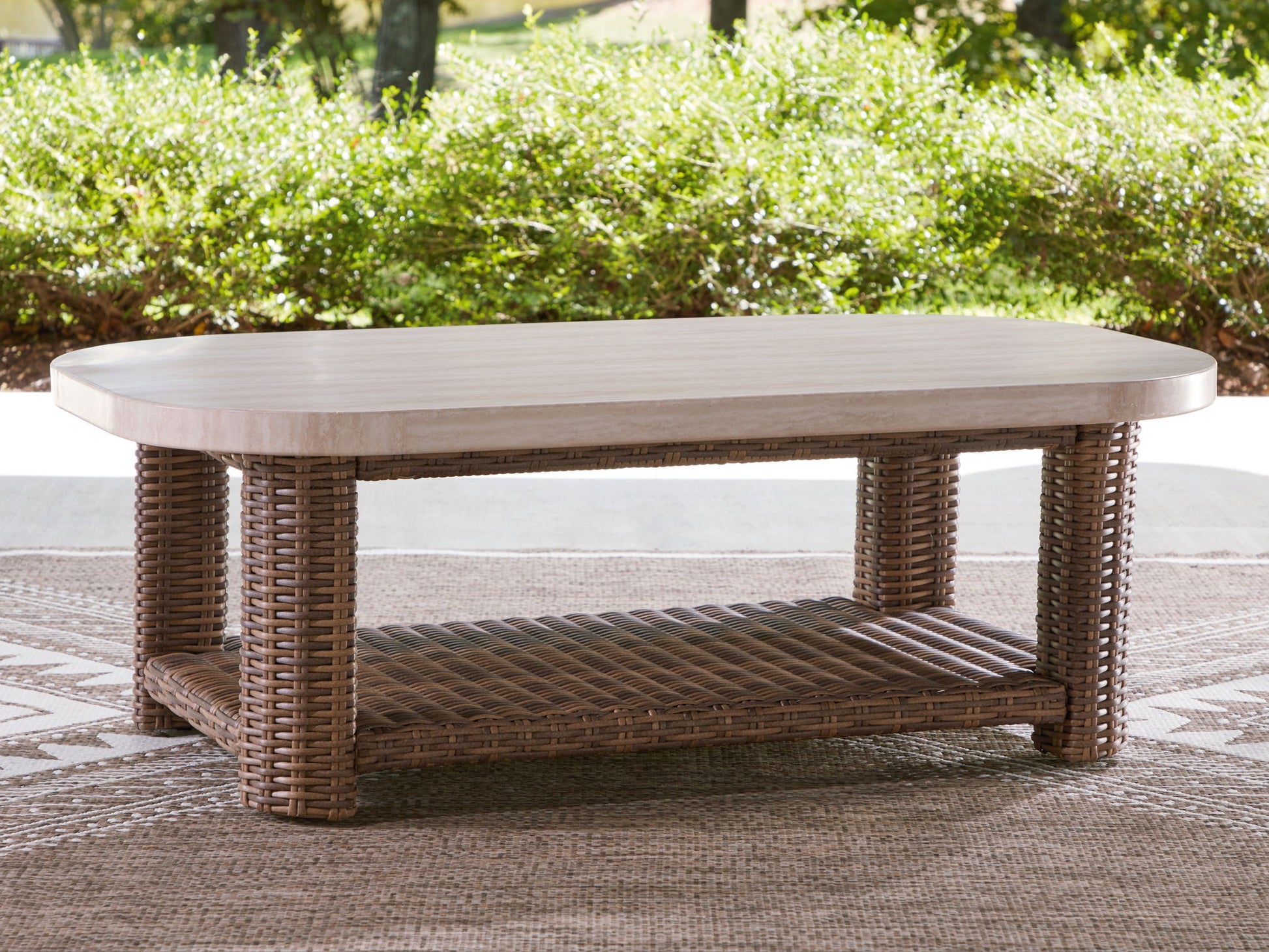 Get back to nature with the relaxed styling of this outdoor coffee table. Crafted with a sturdy aluminum frame and resin wicker, this piece offers exceptional durability and style. How about that smooth tabletop with softly rounded edges for holding nibbles, sips and more? And don't forget the lower shelf. Sounds like fabulous form and function to us.