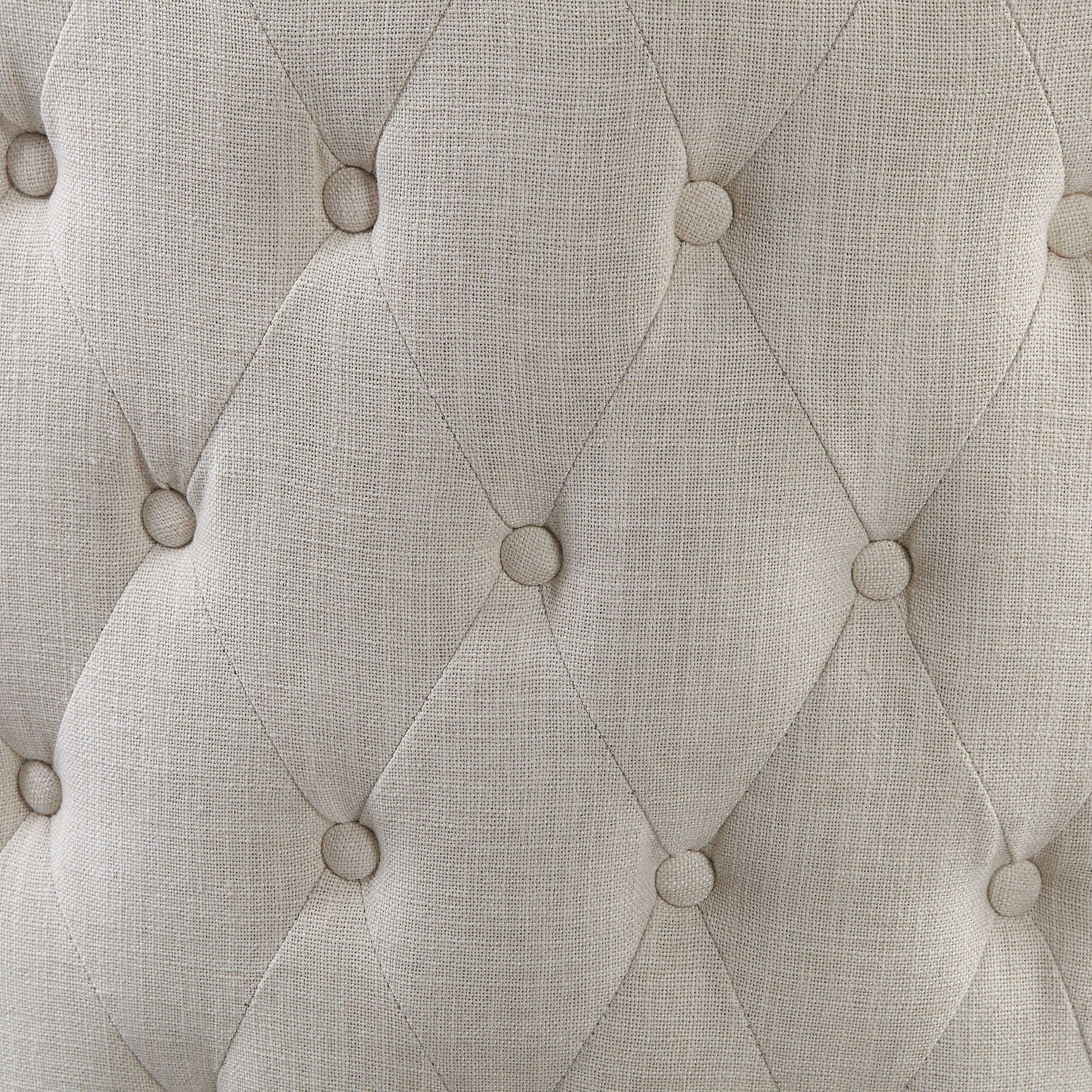 Add Classic Elegance To A Space With This Wing Back Lounge Chair. Covered In A Cream Linen Blend Fabric, Complete With A Button Tufted Surround And Trimmed With Antique Bronze Finished Nail Heads. The Accent Chair Is Set On Oak Finished Dowel Legs With A Lightly Applied Gray Wash, Showcasing The Natural Wood Grain.
