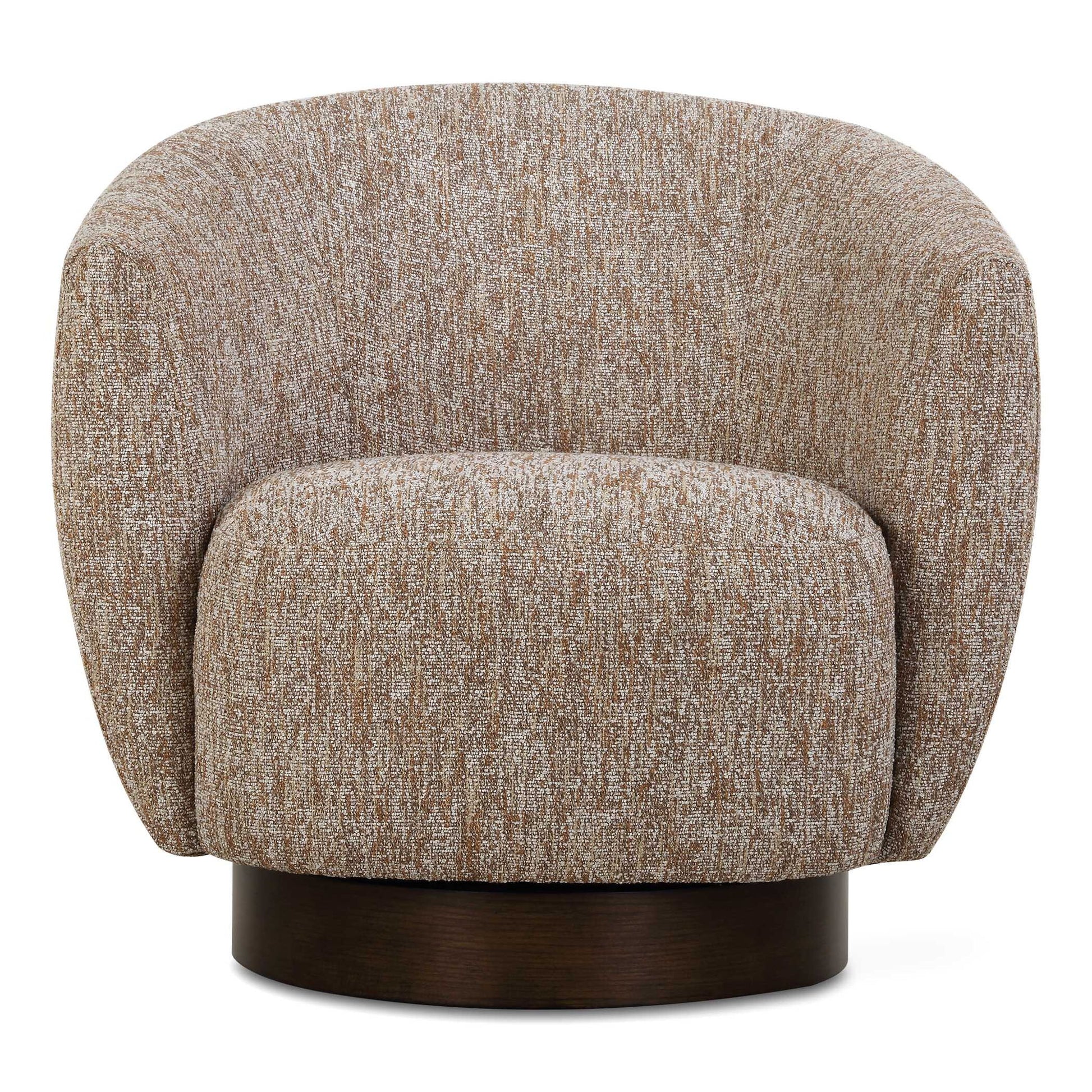 Embodying Richness Of Earth's Warm Tones, The Dunes Barrel Back Swivel Chair Features A Woven Fabric In Mottled Tones Of White, Cocoa, And Rust. Resting On A Plinth Swivel Base In Dark Walnut Stained Oak.