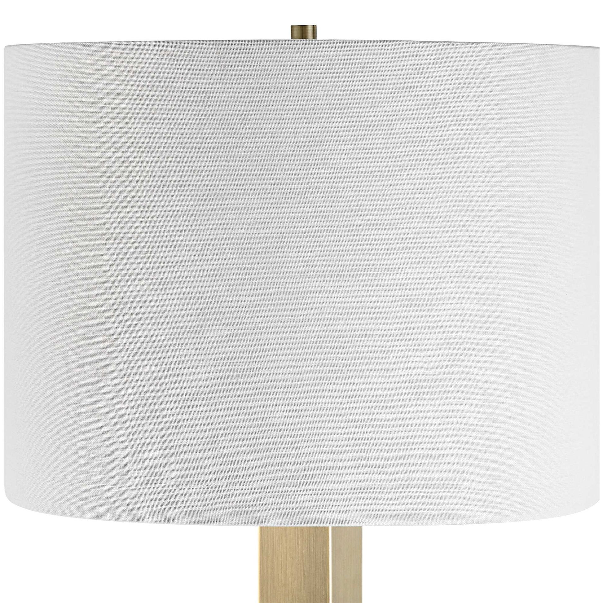This Sophisticated Table Lamp Showcases A Streamlined Metal Column Base Finished In Antique Brass. The Round Hardback Shade Is Covered In White Linen Fabric.