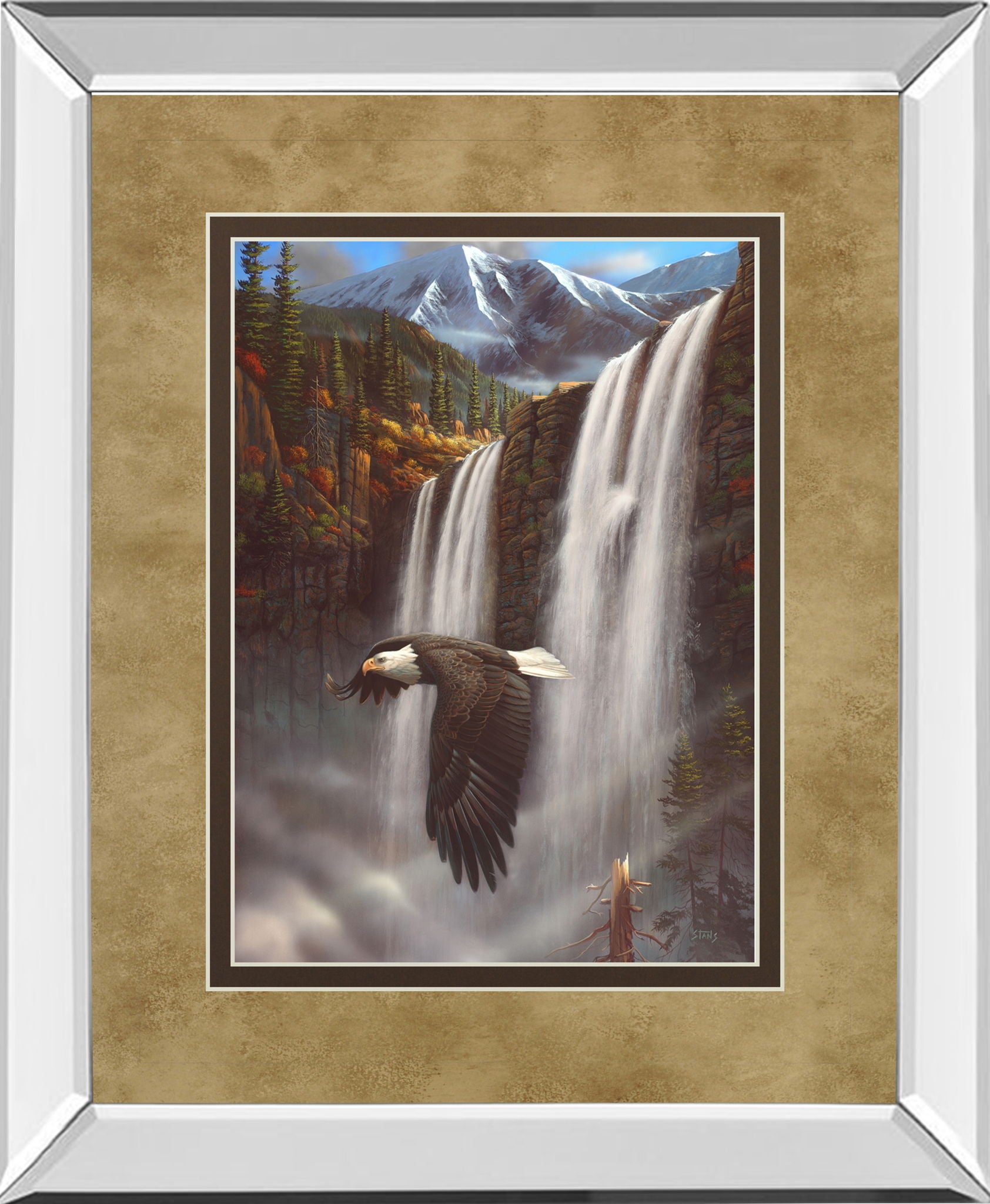 Experience the awe-inspiring beauty of nature with this stunning artwork featuring a bald eagle in mid-flight against the backdrop of a powerful waterfall cascading down rugged cliffs. Snow-capped mountains and lush pine trees frame the scene, evoking a sense of wilderness and freedom. Enhanced by a sleek mirrored frame and double-matted in warm earth tones, this piece brings a refined, gallery-quality presence to any living room, office, or study. Protected by premium real glass, the vibrant colors and intricate details ensure this artwork remains a timeless tribute to the majesty of wildlife and the great outdoors.