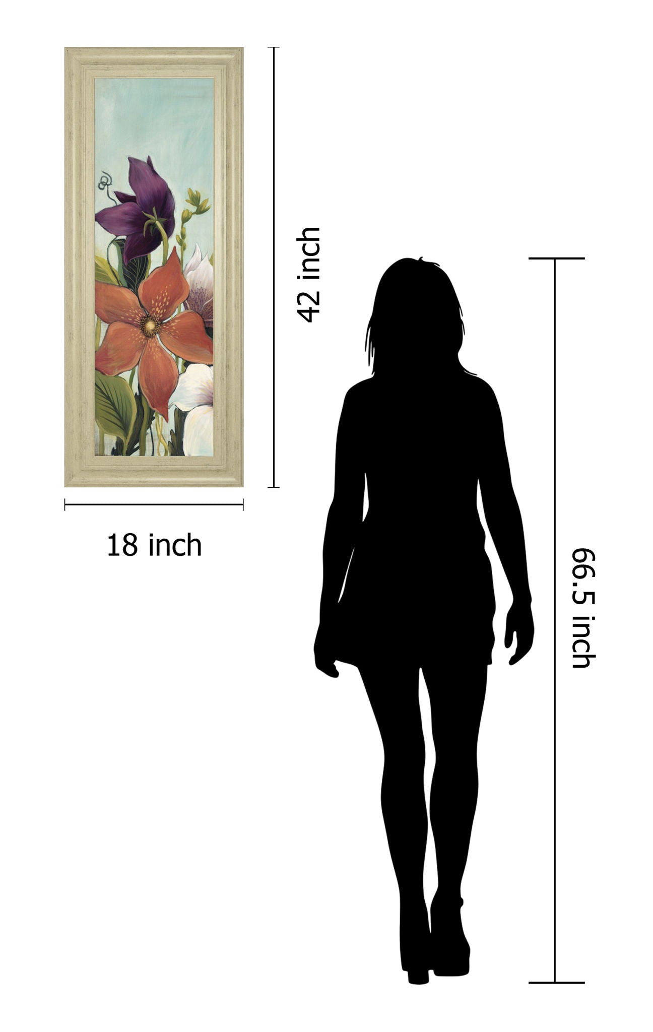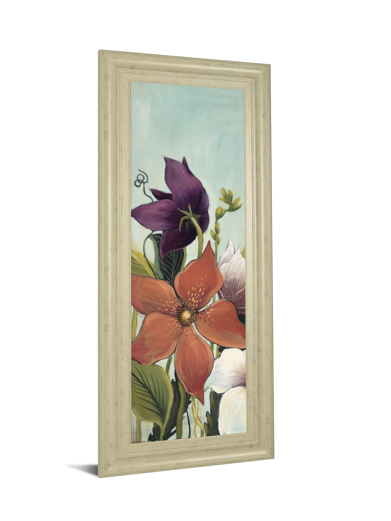 Immerse yourself in the gentle beauty of blooming flowers with this captivating piece that brings nature's elegance indoors. The artwork features a stunning arrangement of vibrant purple, orange, and white blossoms set against a serene blue backdrop, creating a peaceful yet lively atmosphere. Encased in a sophisticated ivory bliss frame and protected by premium real glass, this 42 by 18-inch framed wall art is crafted with expert care, ready to add a timeless botanical charm to your living room or bedroom decor.