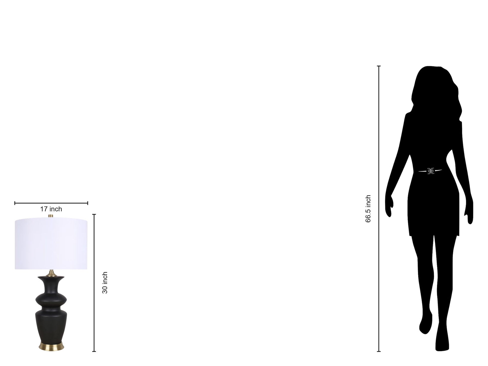 The Elegance Radiance lamp set exudes sophistication with its striking black ceramic base and soft gold metal accents. Its urn-shaped silhouette is complemented by a crisp white linen drum shade, creating a warm and inviting glow. Ideal for living rooms or bedrooms, this lamp offers both style and functionality with its 3-way switch, allowing you to customize the lighting to suit any mood or occasion.