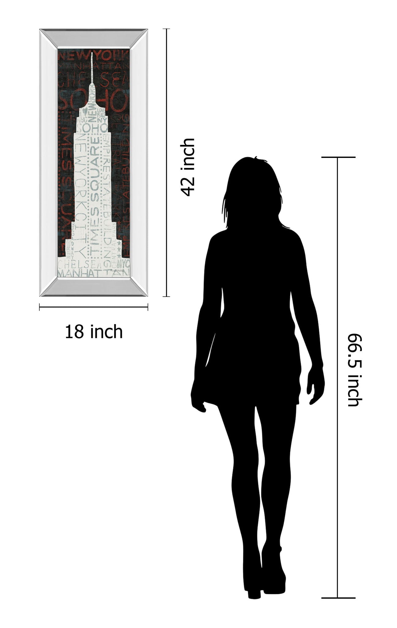 Capture the essence of New York City with this captivating Empire Silhouette framed wall art. The piece features a bold graphic of the iconic Empire State Building, creatively composed of famous NYC neighborhoods and landmarks in a harmonious typographic design. Set against a textured black background with muted red accents, the artwork exudes modern urban charm. Encased in a sleek 2.5-inch mirrored frame, it reflects light beautifully, adding depth and sophistication to any living room or office. Crafted with premium real glass for lasting clarity and vibrant detail, this vertical piece is ready to hang and brings a touch of metropolitan elegance to your space.