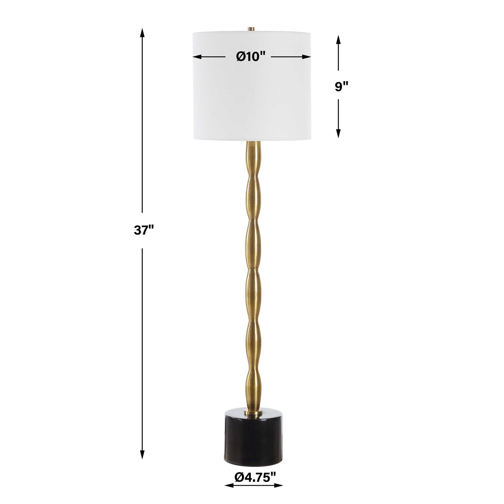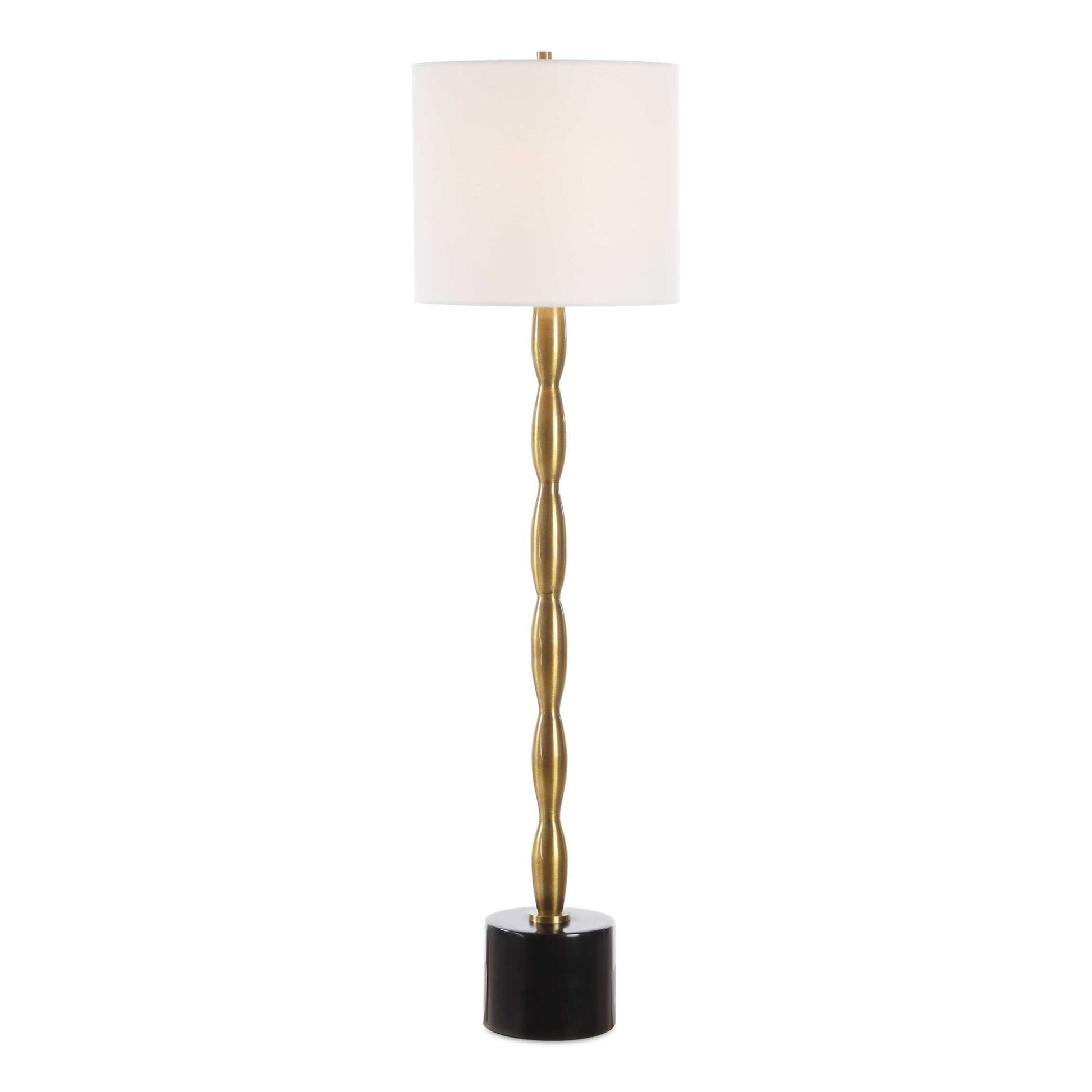 Finished In A Plated Antique Brass And Elegantly Anchored On A Black Marble Foot, The Ezra Buffet Lamp Effortlessly Combines Contemporary And Traditional Styles. A White Linen Round Hardback Shade Completes The Piece.