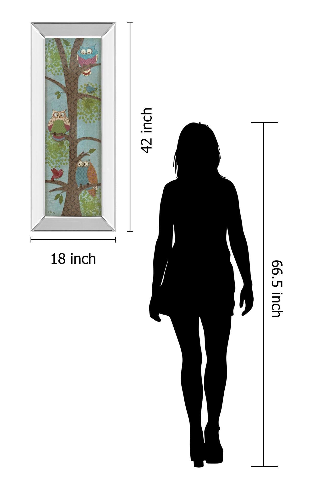 Step into a world of playful enchantment with this charming framed print featuring whimsical owls perched on a patterned tree. The artwork's soft blue background and vibrant hues of green, brown, red, and purple create a lively yet soothing atmosphere perfect for children's rooms, nurseries, or play areas. Encased in a sleek mirrored frame, the piece adds a modern reflective touch that enhances the intricate details and colors, bringing a nature-inspired joy and wonder to your space. Professionally crafted and ready to hang, this delightful wall art invites imagination and warmth into any room.