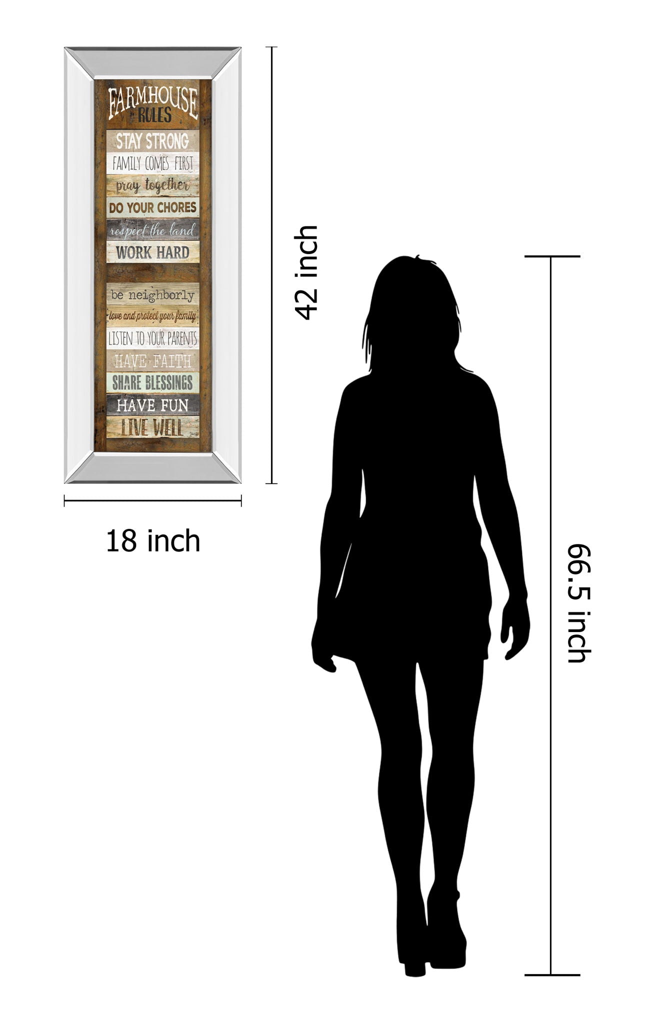Invite warmth and timeless wisdom into your home with this charming farmhouse rules wall art. Featuring a mirrored 2.5-inch frame that catches and reflects light, this piece adds a subtle elegance to rustic decor. The graphic print displays heartfelt sayings on a weathered wood background, reminding all who see it of the values that make a house a home. Crafted with premium real glass to preserve vibrant colors and crisp details, it's ready to hang in your living room, kitchen, or entryway. This artful reminder of family, faith, and hard work brings a cozy, country spirit to any space.