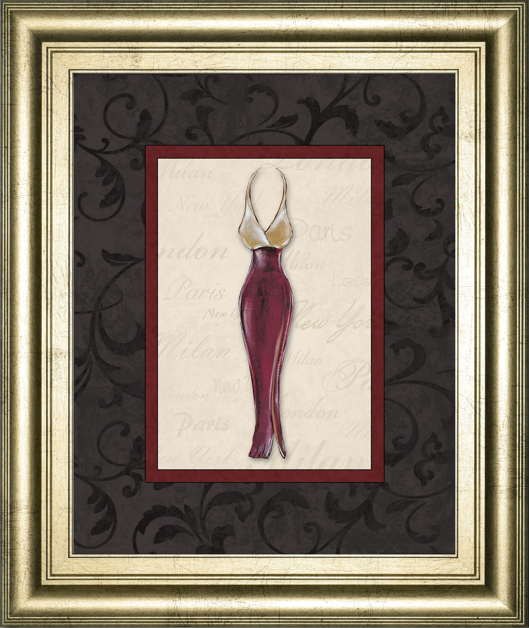 Step into a world of refined style with this captivating framed wall art featuring an elegant dress silhouette. Rendered in rich burgundy and soft beige hues, the artwork is set against a subtle script background that whispers the names of fashion capitals like Paris and Milan. The luxurious gilded frame enhances the piece’s depth and sophistication, making it a perfect accent for living rooms or bedrooms seeking a touch of contemporary chic. Crafted with premium materials and protected by clear glass, this ready-to-hang art piece invites fashion lovers to celebrate timeless elegance and modern design in their home decor.