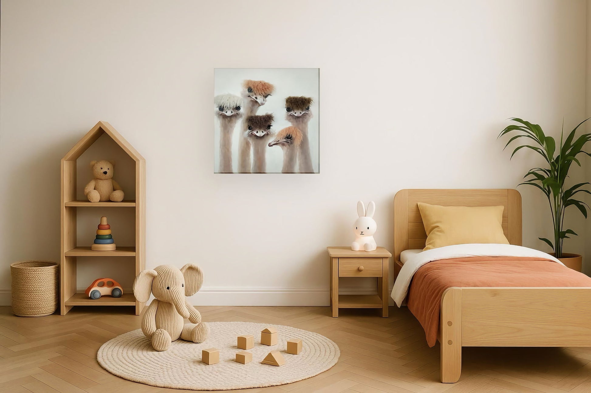 - Whimsical ostrich design adds humor to any space