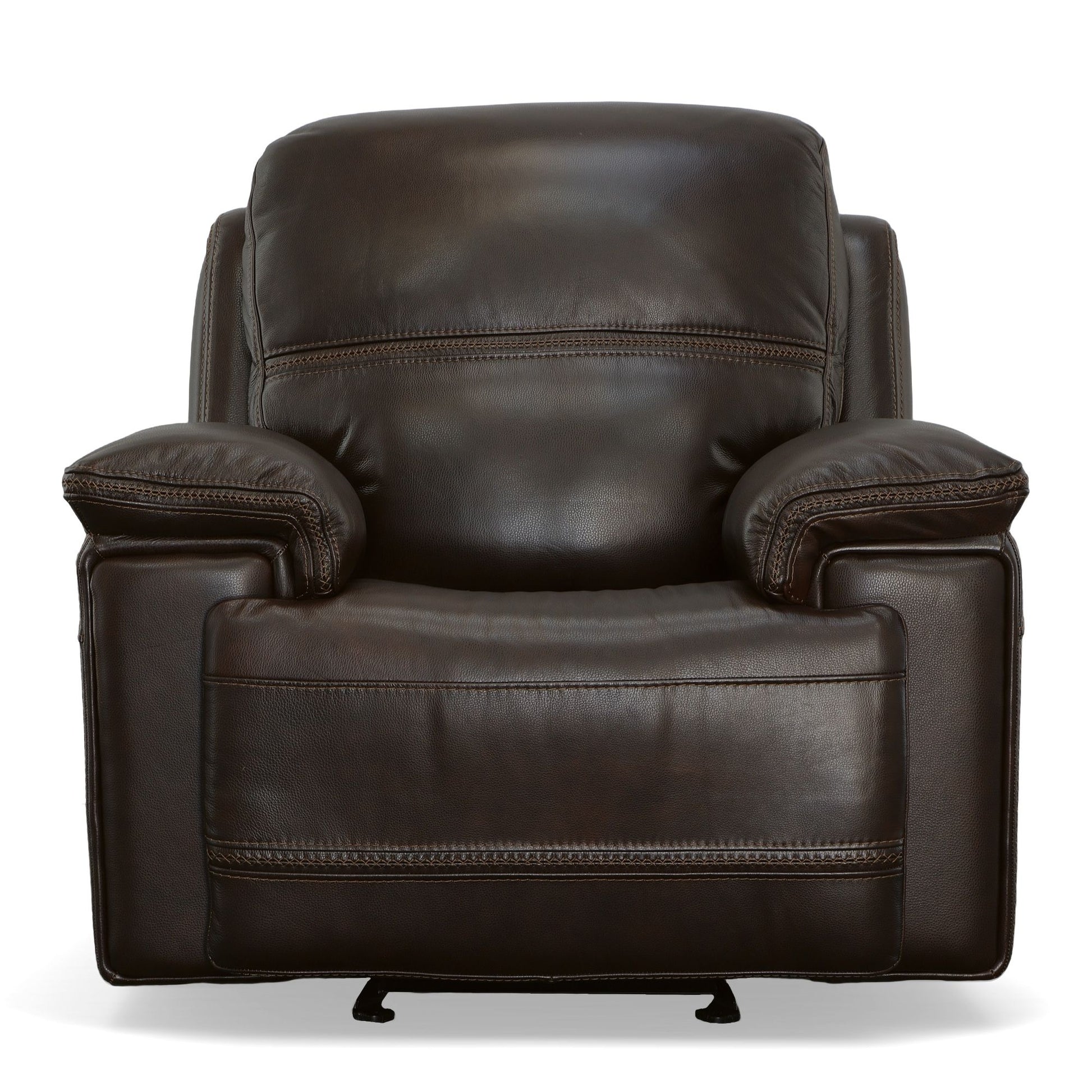 Introduce a sophisticated touch to your living room with the Fenwick power gliding recliner with power headrest. This elegant piece showcases unique, banded cross-stitching details that add a refined texture and visual appeal to its premium, cognac brown leather upholstery. The plush, divided back cushion and fully padded footrest offer supreme comfort. Gently glide back and forth or kick back and relax with independently adjustable recline and headrest support for your ideal position at the touch of a button. Flexsteel’s patented Blue Steel Spring™ technology offers unparalleled durability and support, making this recliner a lasting addition to your home.