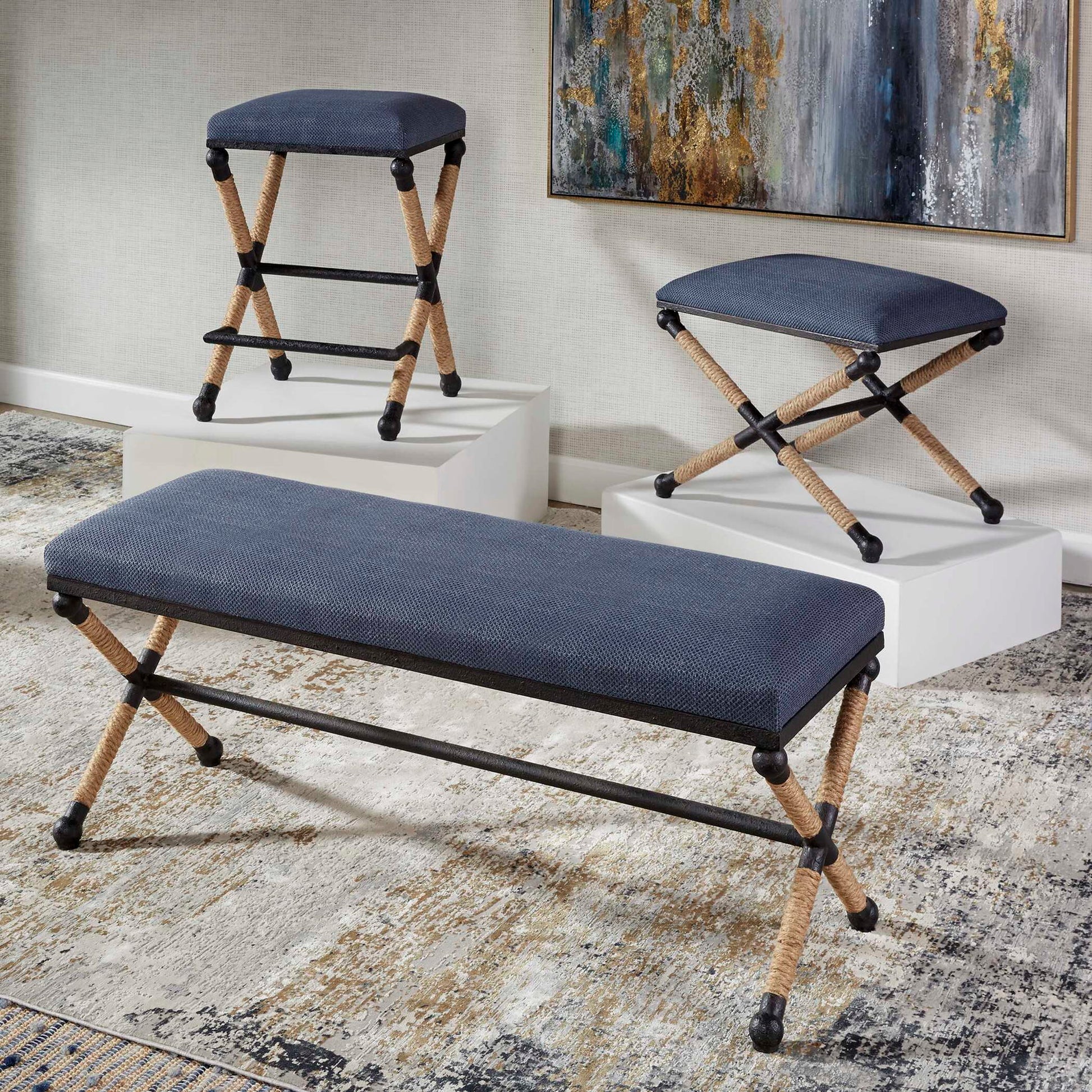 Rustic Iron Frame With A Nautical Touch, Wrapped In Natural Fiber Rope Accents. Cushioned Top Is A Cotton Blend In A Rich Textured Navy Blue.