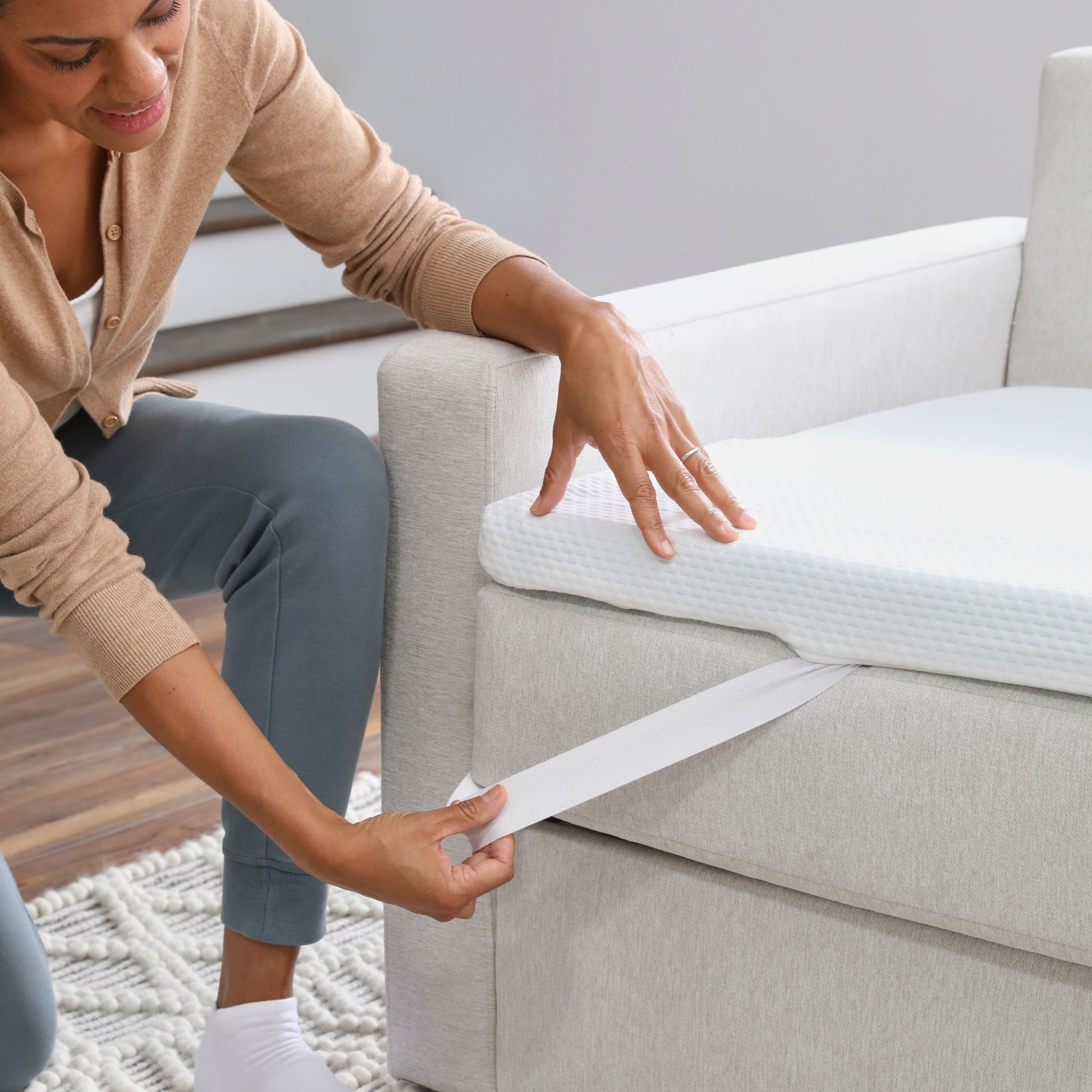 Evolve your Flex modular seating system into a bed with the Flex sleep kit. Complete with a memory foam topper, fitted sheet, top sheet and pillowcase, this kit is designed to fit over any three Flex seats, protecting your furniture while accommodating extra guests at night. Easily store the sleep kit in a Flex storage ottoman or under the spring unit of any Flex seat.