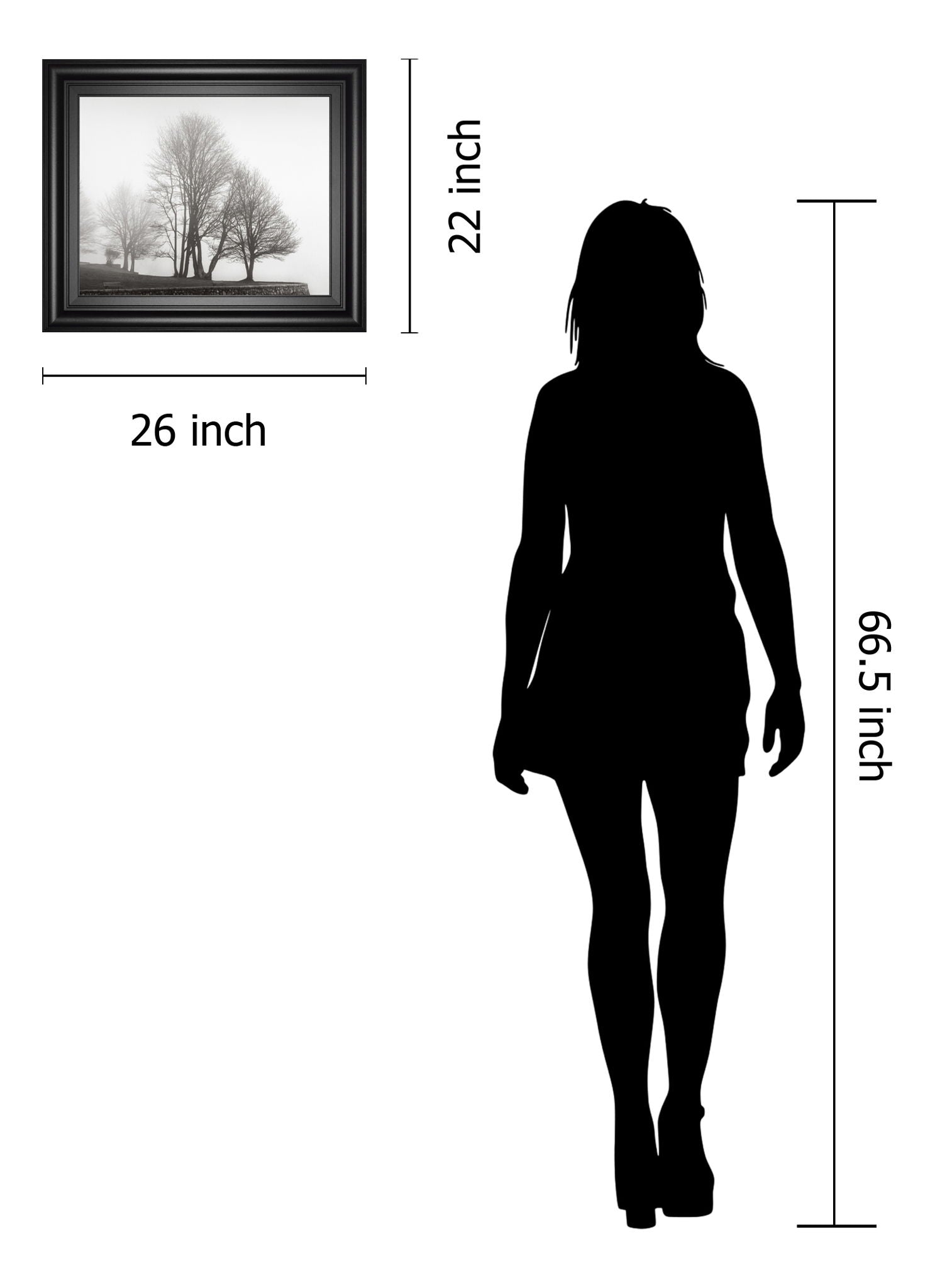 Step into a quiet moment where nature whispers its secrets through a veil of mist. This framed photograph captures the delicate silhouettes of bare trees standing tall against a soft, foggy backdrop at dusk, evoking a sense of calm and introspection. The subtle interplay of black, gray, and white tones creates a timeless scene that brings peaceful serenity to any living room, bedroom, or office. Encased in a sleek midnight aura frame with premium real glass, this piece offers both elegance and durability, ready to transform your space with its tranquil, country farmhouse charm.
