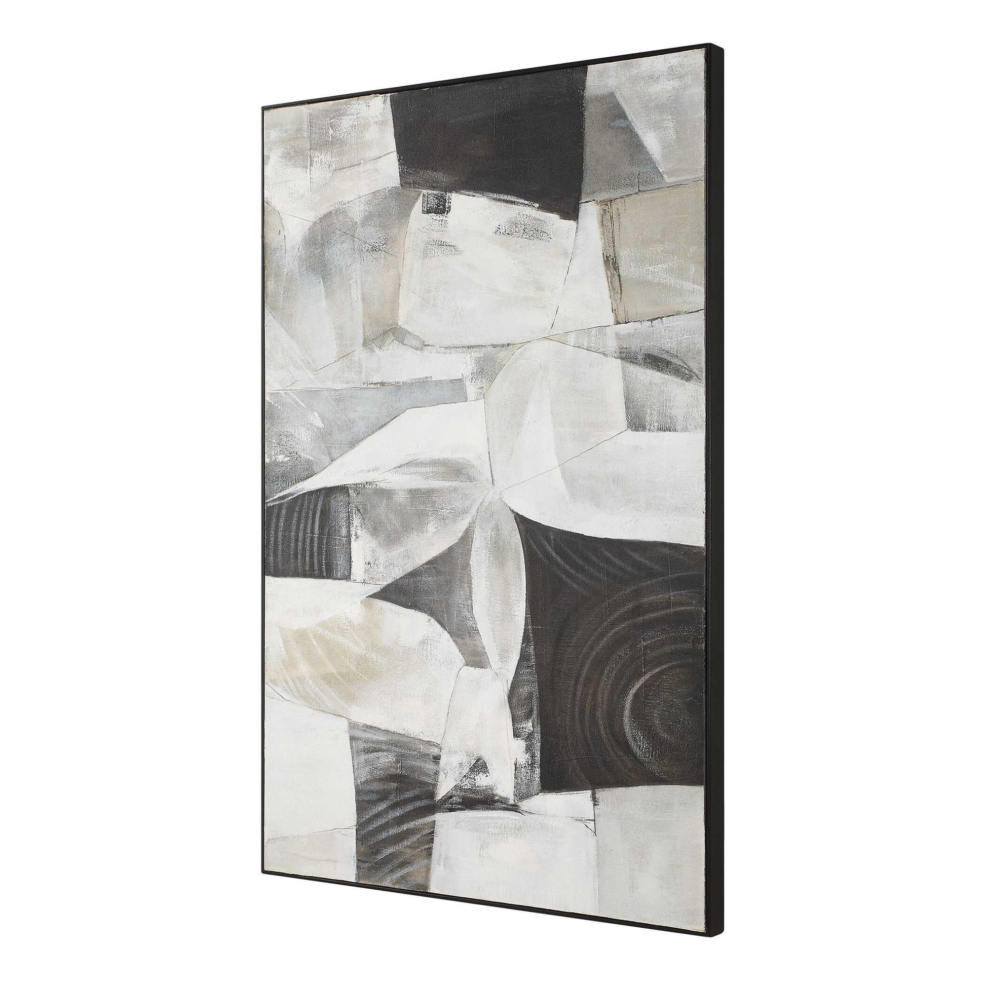 The Folding Time Framed Canvas Features An Abstract Design With Strong Geometric Influence That Evokes The Feeling Of Folded Paper, With Overlapping And Intersecting Shapes. The Monochromatic Color Palette Is Emphasized By A Thin, Black Gallery Frame. Due To The Handcrafted Nature Of This Work, Each Piece May Have Subtle Differences. This Piece May Be Hung Horizontal Or Vertical.